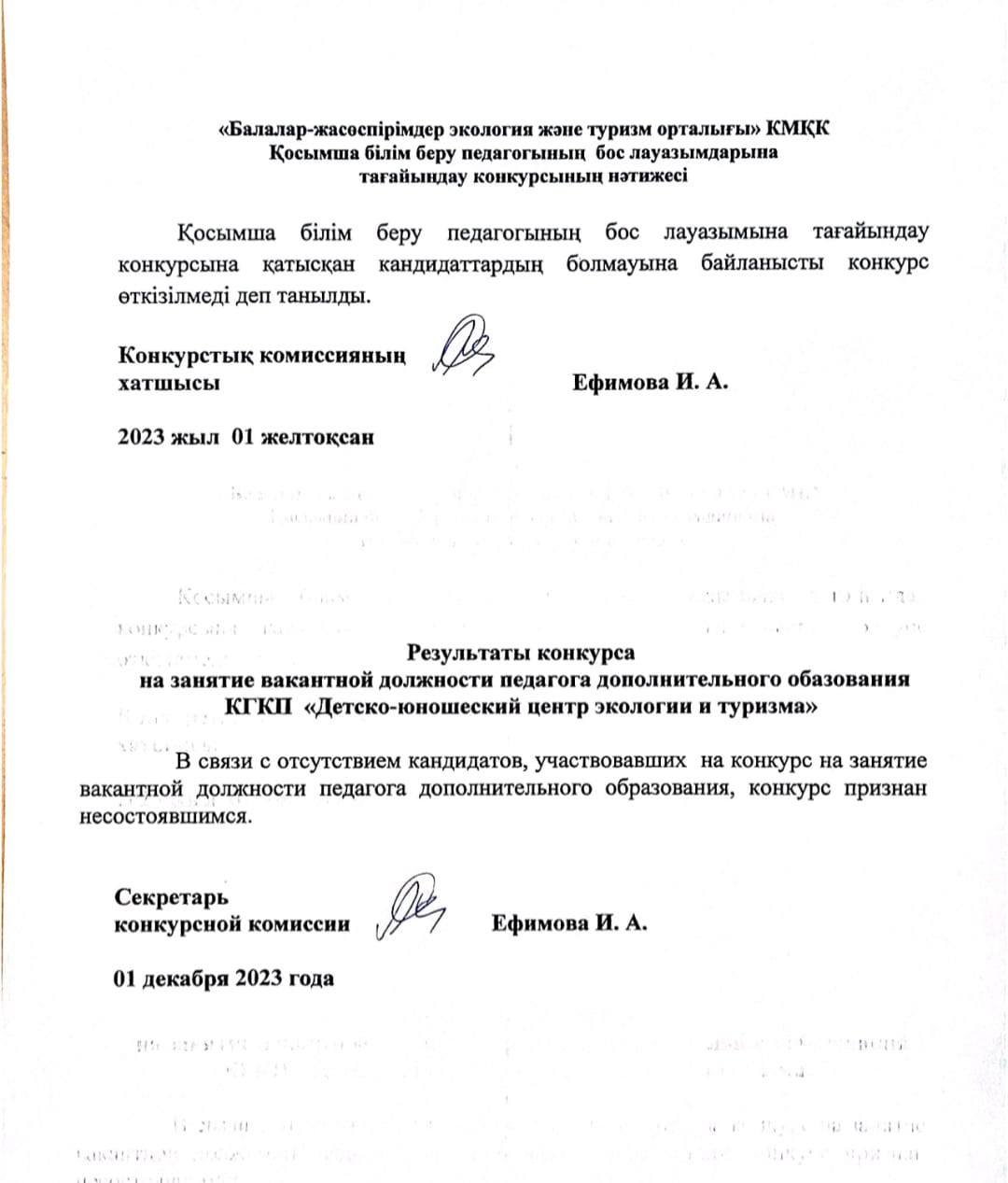 Результаты конкурса на занятие вакантной должности педагога дополнительного обазования КГКП «Детско-юношеский центр экологии и туризма»