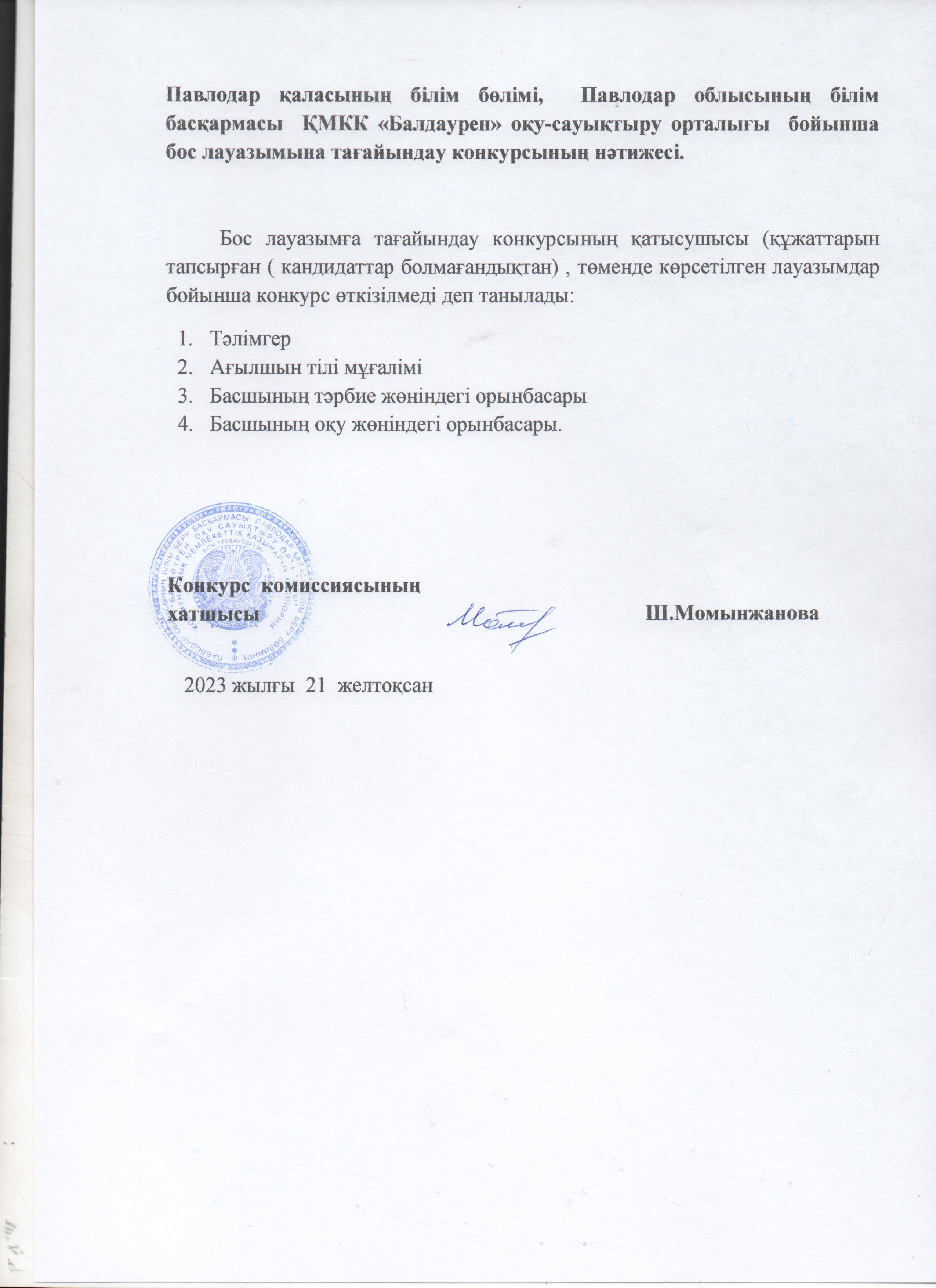 Павлодар қаласының білім бөлімі, Павлодар облысының білім басқармасы ҚМКК «Балдаурен» оқу-сауықтыру орталығы бойынша бос лауазымына тағайындау конкурсының нәтижесі.