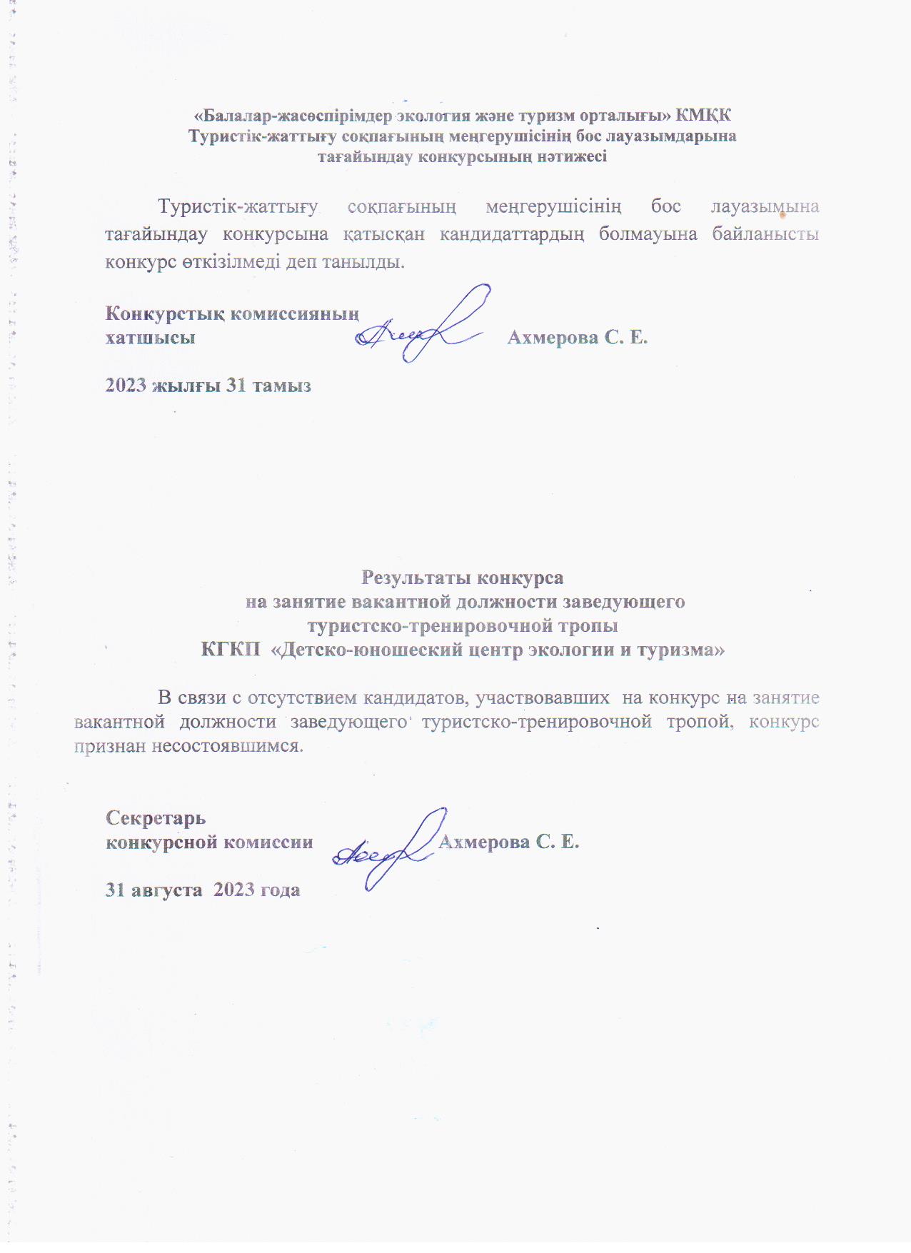 Результаты конкурса на занятие вакантной должности заведующего туристско-тренировочной тропы КГКП «Детско-юношеский центр экологии и туризма» | Скачать |