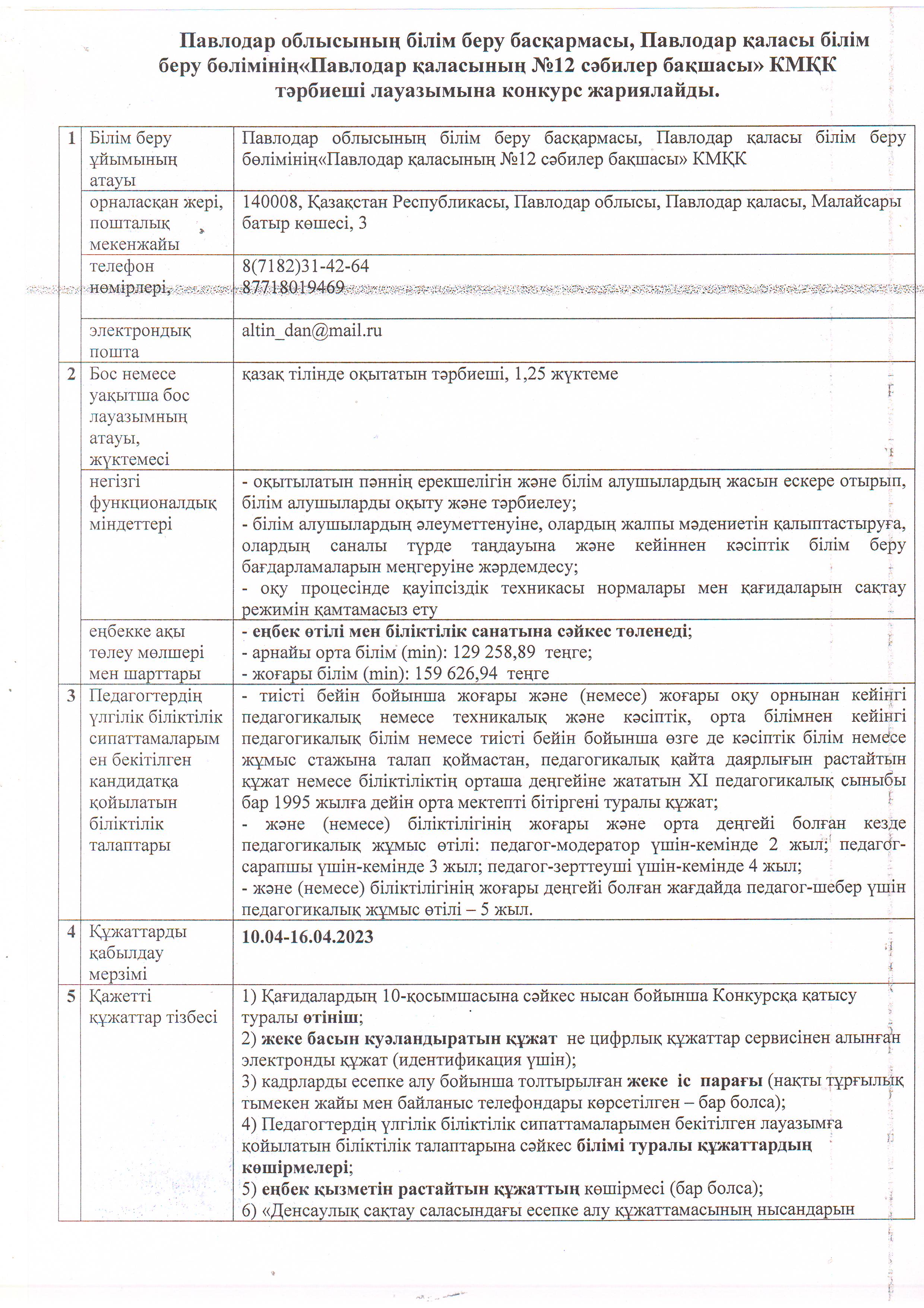 ОБЪЯВЛЕНИЕ О ПРОВЕДЕНИИ КОНКУРСА НА ВАКАНТНЫЕ МЕСТА ПЕДАГОГИЧЕСКИХ РАБОТНИКОВ | көшіріп алу қарау |