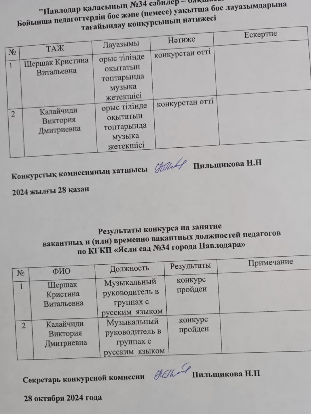 КГКП«Ясли-сад № 34 города Павлодара» объявляет конкурс на должность музыкального руководителя в группы с русским языком обучения | көшіріп алу қарау |