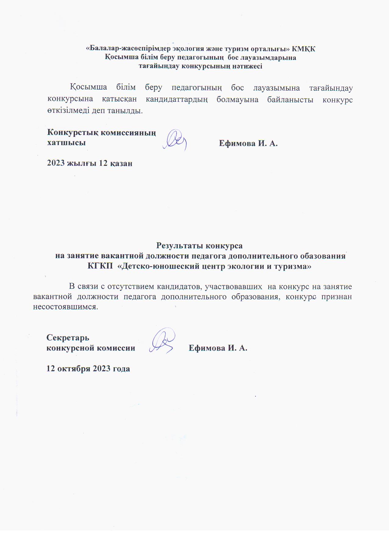 «Балалар-жасөспірімдер экология және туризм орталығы» КМҚК Қосымша білім беру педагогының бос лауазымдарына тағайындау конкурсының нәтижесі