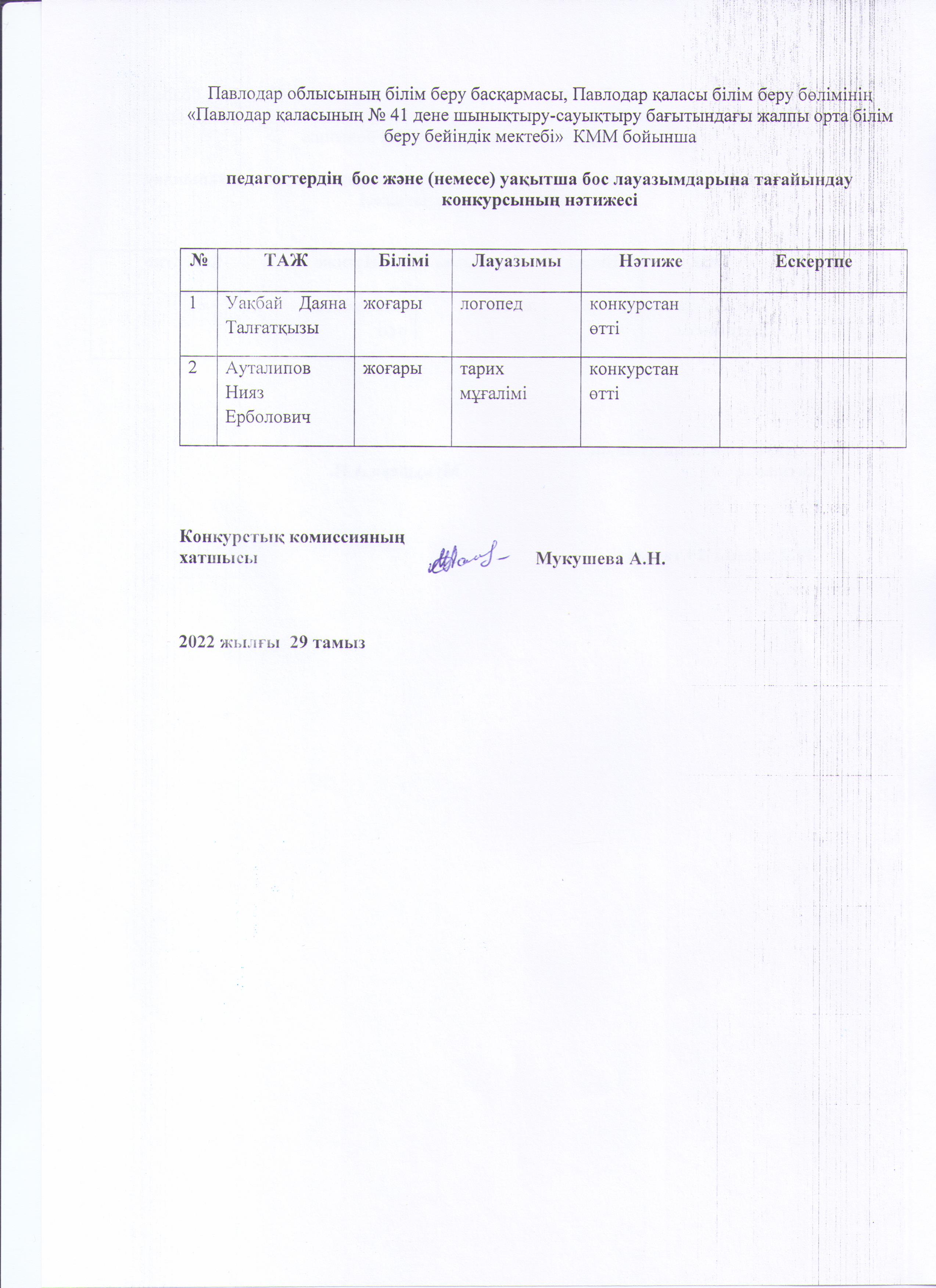 Павлодар облысының білім беру басқармасы, Павлодар қаласы білім беру бөлімінің «Павлодар қаласының № 41 дене шынықтыру-сауықтыру бағытындағы жалпы орта білім беру бейіндік мектебі» КММ бойынша педагогтердің бос және (немесе) уақытша бос лауазымдарына тағайындау конкурсының нәтижесі