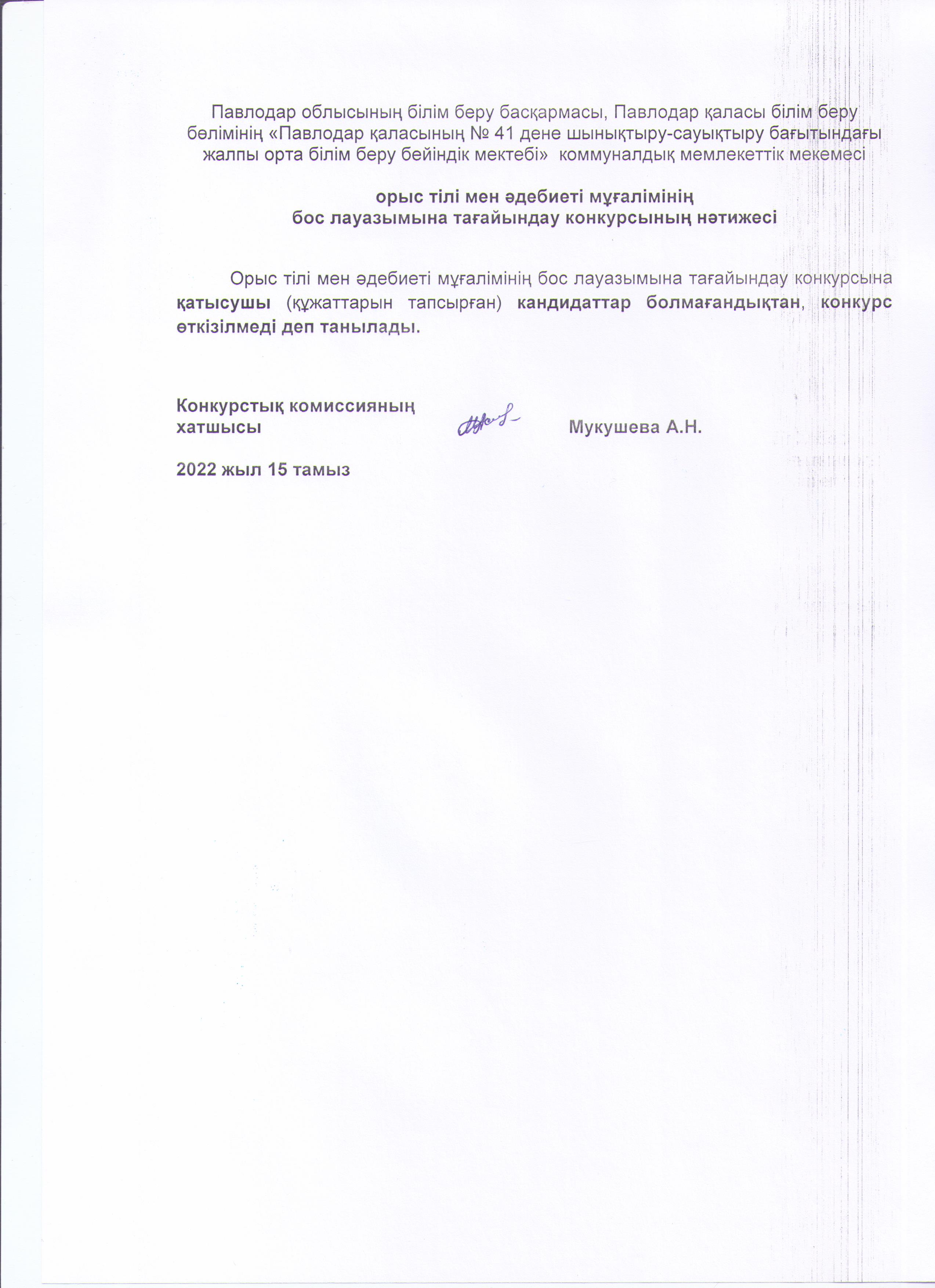 Павлодар облысының білім беру басқармасы, Павлодар қаласы білім беру бөлімінің «Павлодар қаласының № 41 дене шынықтыру-сауықтыру бағытындағы жалпы орта білім беру бейіндік мектебі» коммуналдық мемлекеттік мекемесі орыс тілі мен әдебиеті мұғалімінің бос лауазымына тағайындау конкурсының нәтижесі
