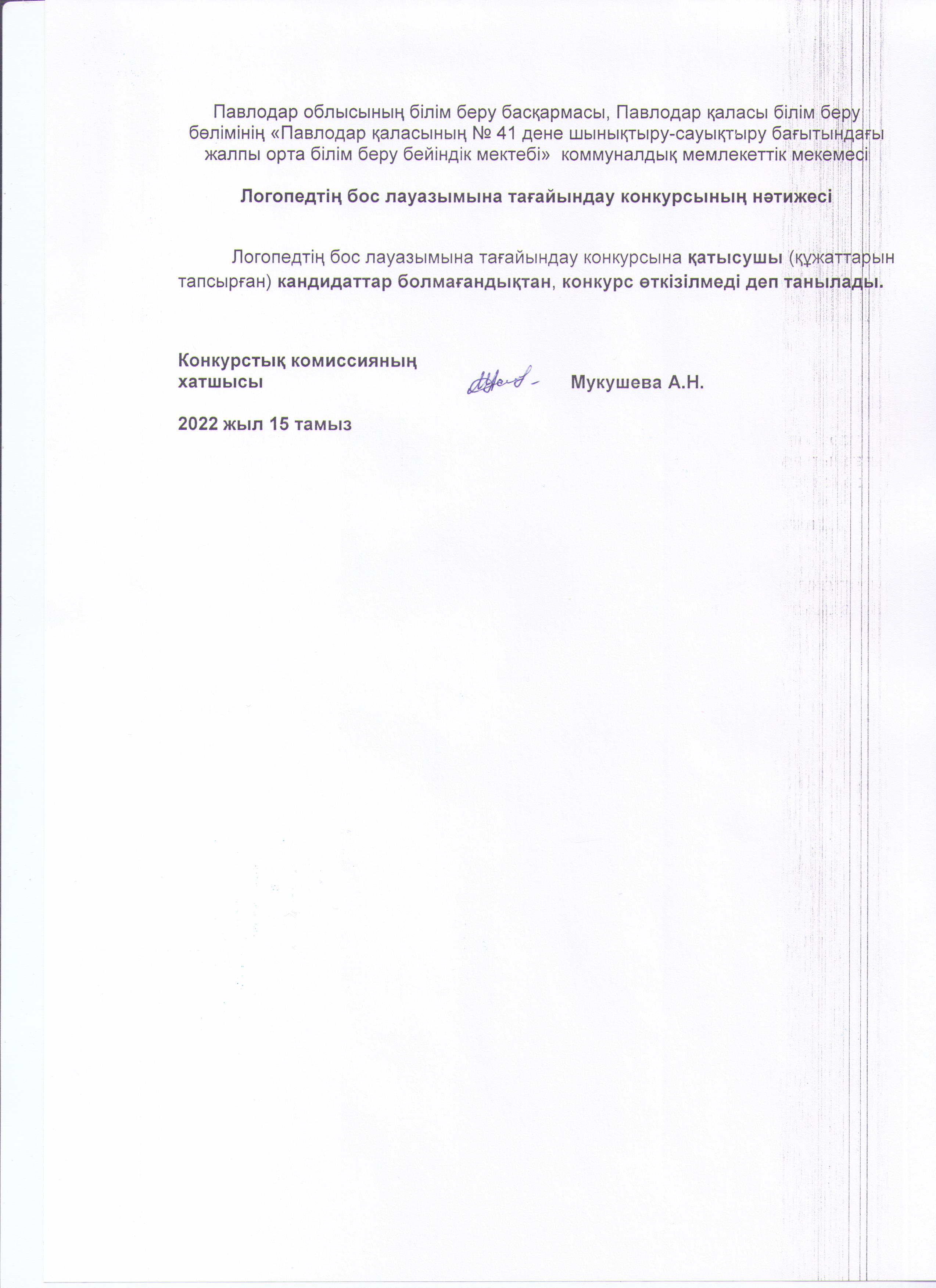 Павлодар облысының білім беру басқармасы, Павлодар қаласы білім беру бөлімінің «Павлодар қаласының № 41 дене шынықтыру-сауықтыру бағытындағы жалпы орта білім беру бейіндік мектебі» коммуналдық мемлекеттік мекемесі Логопедтің бос лауазымына тағайындау конкурсының нәтижесі