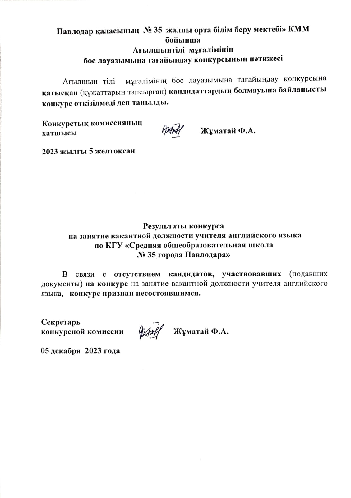 Павлодар қаласының № 35 жалпы орта білім беру мектебі» КММ бойынша Ағылшын тілі мұғалімінің бос лауазымына тағайындау конкурсының нәтижесі