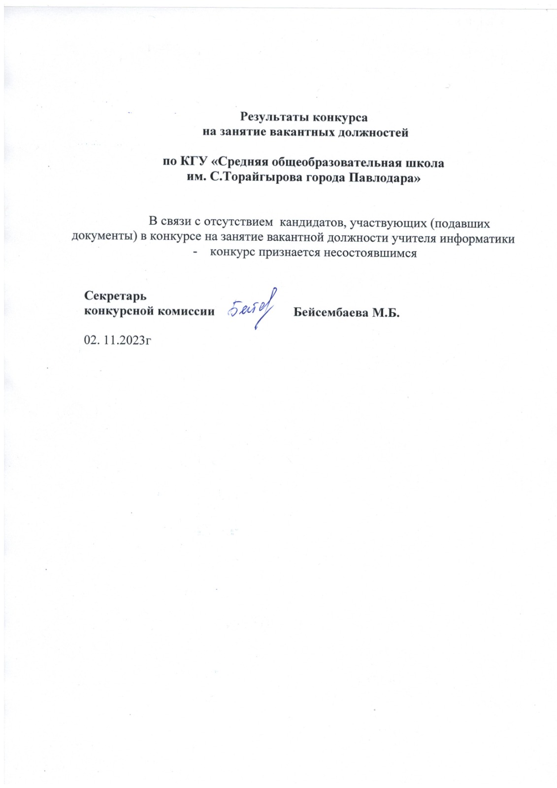 "Павлодар қаласының С.Торайғыров атындағы жалпы орта білім беру мектебі "КММ бойынша педагогтердің бос(немесе) уакытша бос лауазымына тағайындау конкурсының нәтижесі