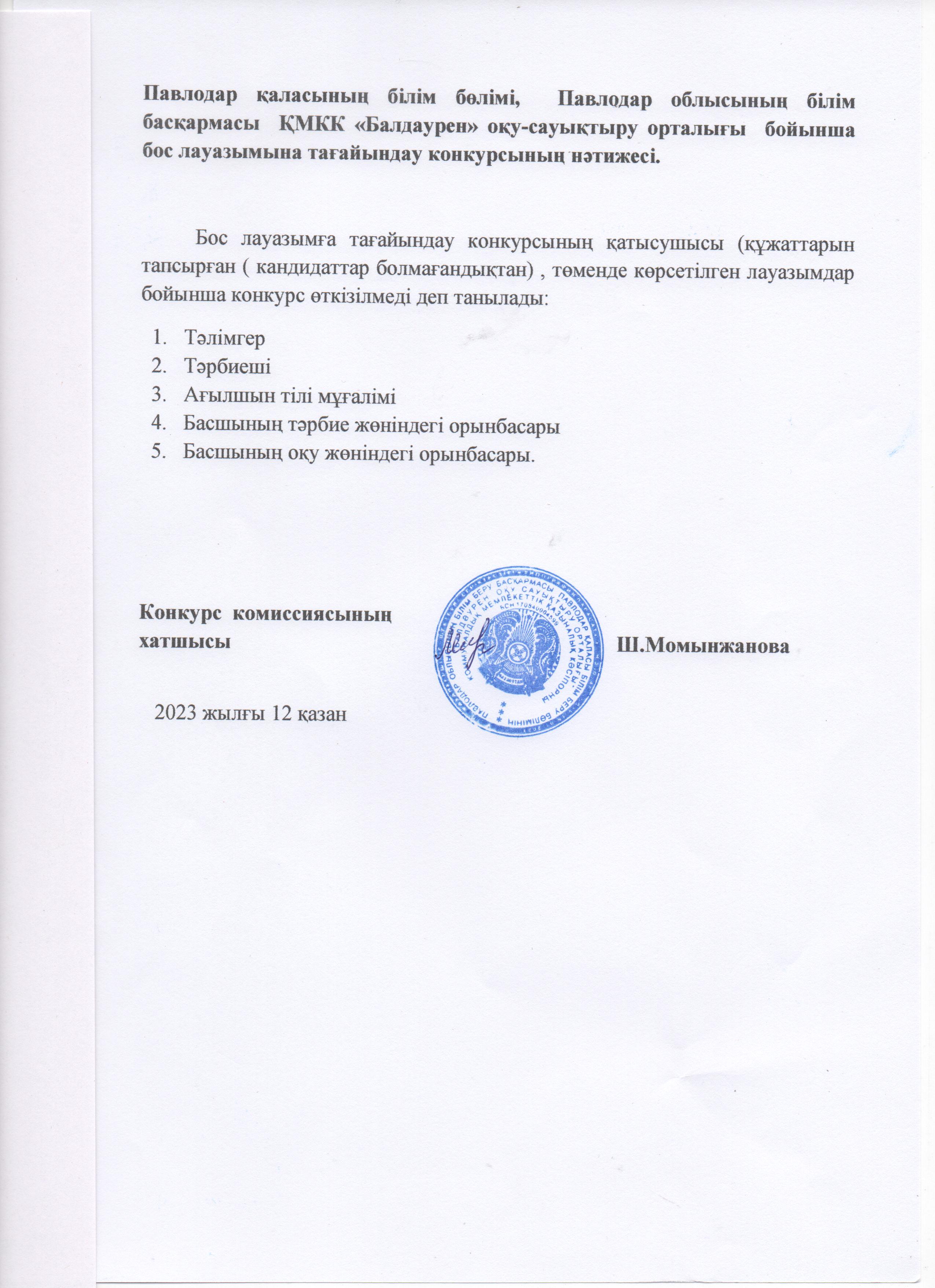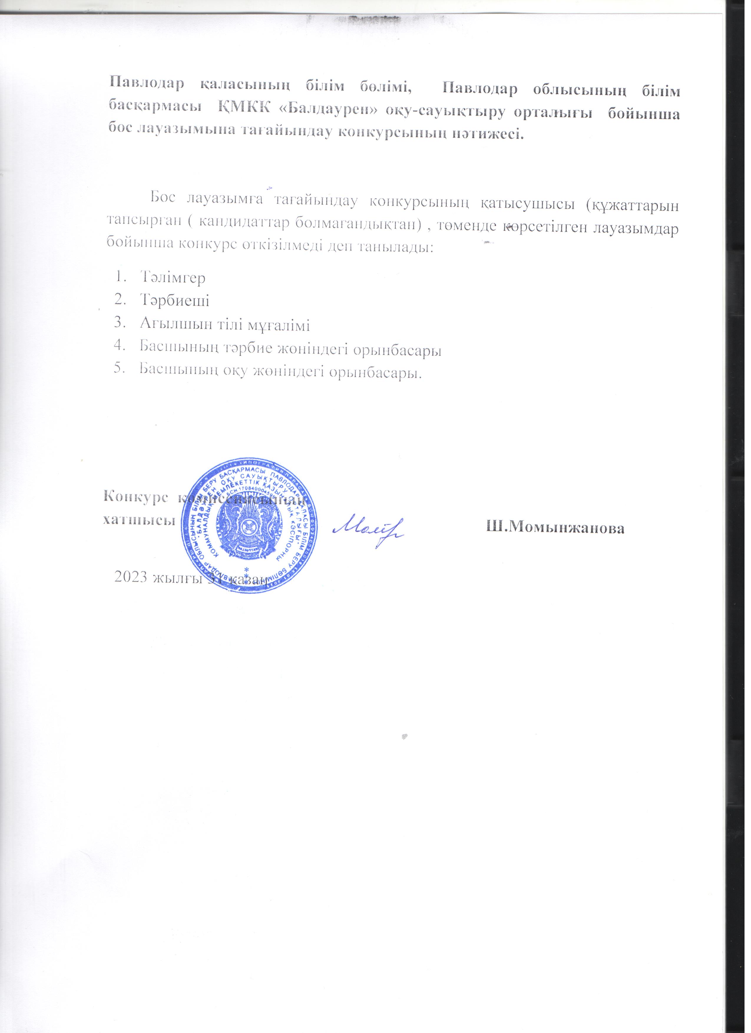 Павлодар қаласының білім бөлімі, Павлодар облысының білім басқармасы ҚМКК «Балдаурен» оқу-сауықтыру орталығы бойынша бос лауазымына тағайындау конкурсының нәтижесі. | көшіріп алу |
