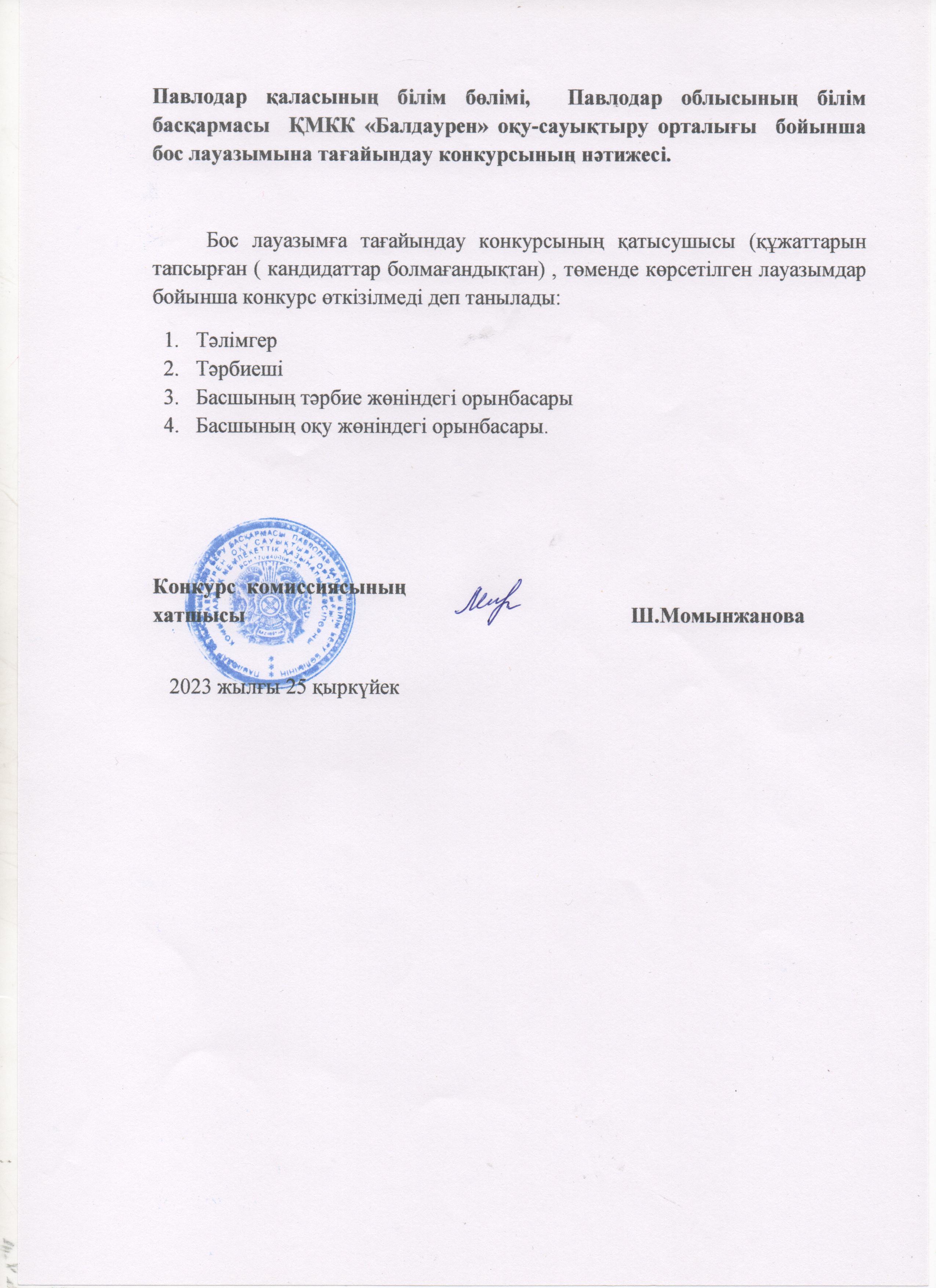Павлодар қаласының білім бөлімі, Павлодар облысының білім басқармасы ҚМКК «Балдаурен» оқу-сауықтыру орталығы бойынша бос лауазымына тағайындау конкурсының нәтижесі.