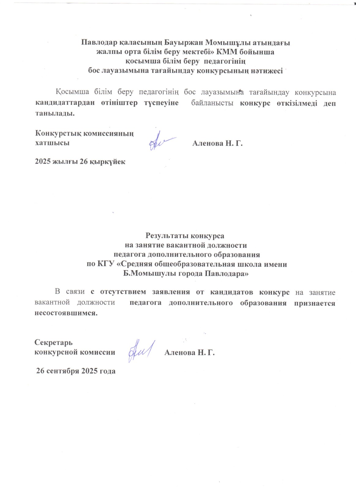 «Павлодар қаласының Бауыржан Момышұлы атындағы жалпы орта білім беру мектебі» КММ қазақ тілінде оқытатын өосымша білім беру педагогі лауазымына конкурсының нәтижесі