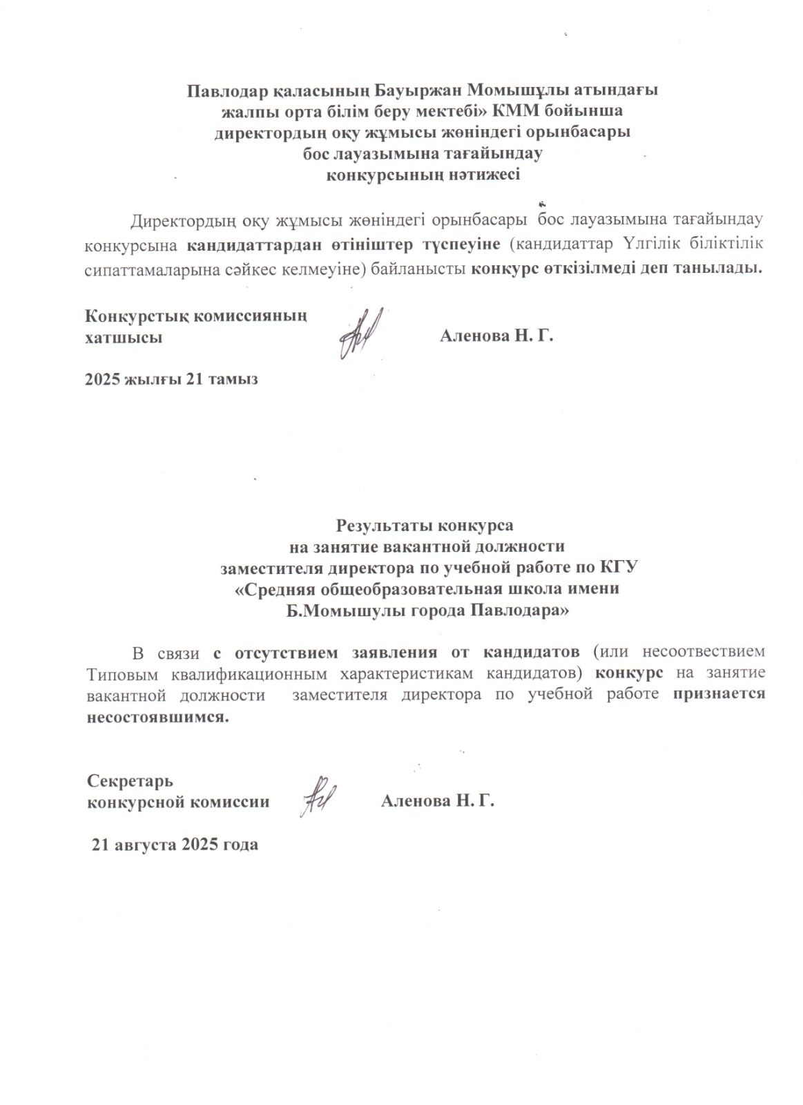 «Павлодар қаласының Бауыржан Момышұлы атындағы жалпы орта білім беру мектебі» КММ қазақ тілінде оқытатын директордың тәрбие жұмысы жөніндегі орынбасары лауазымына конкурсының нәтижесі