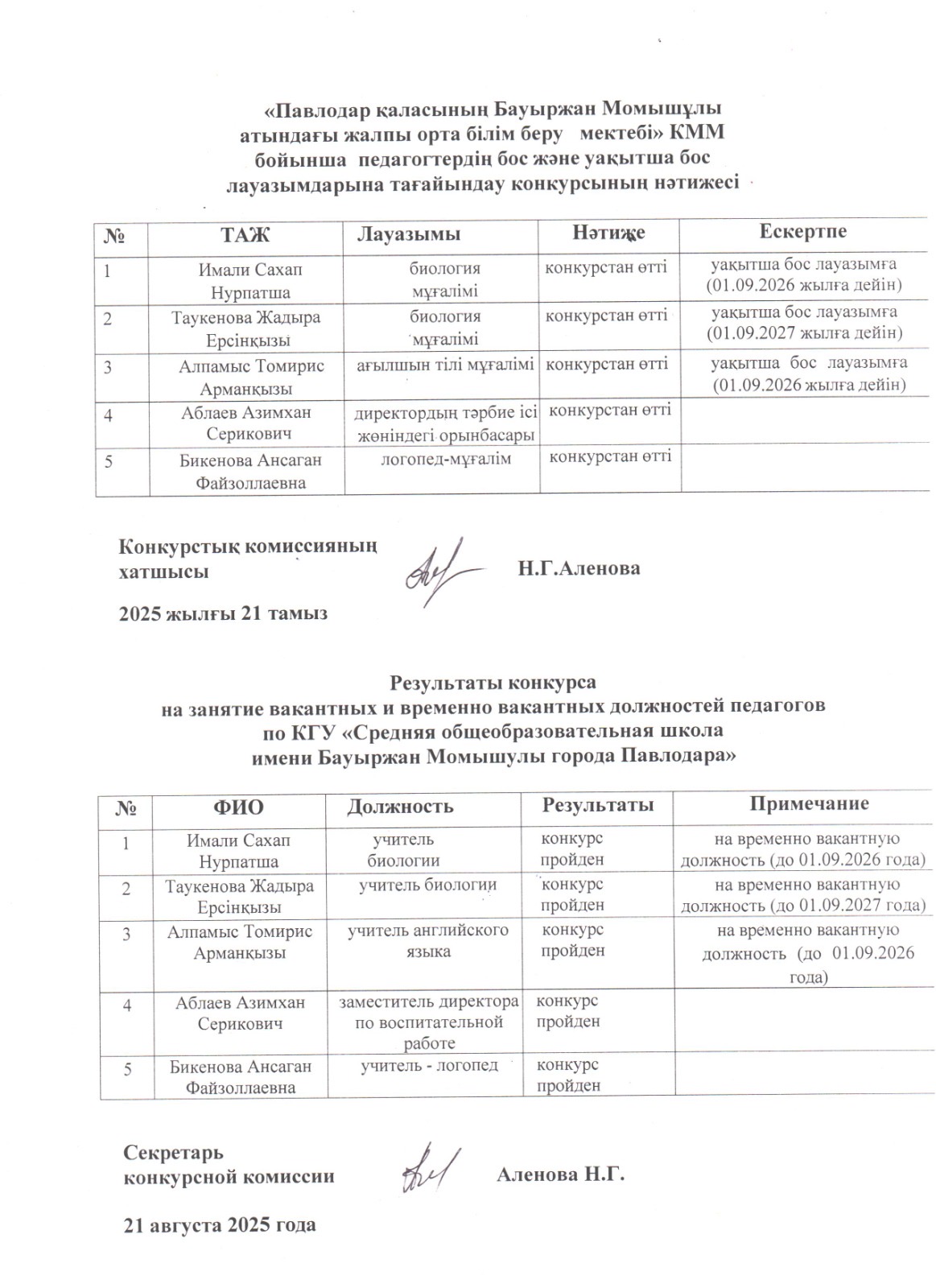 «Павлодар қаласының Бауыржан Момышұлы атындағы жалпы орта білім беру мектебі» КММ қазақ тілінде оқытатын директордың тәрбие жұмысы жөніндегі орынбасары лауазымына, биология, ағылшын тілі мұғалімдері, логопед-мұғалім конкурсының нәтижесі | көшіріп алу |