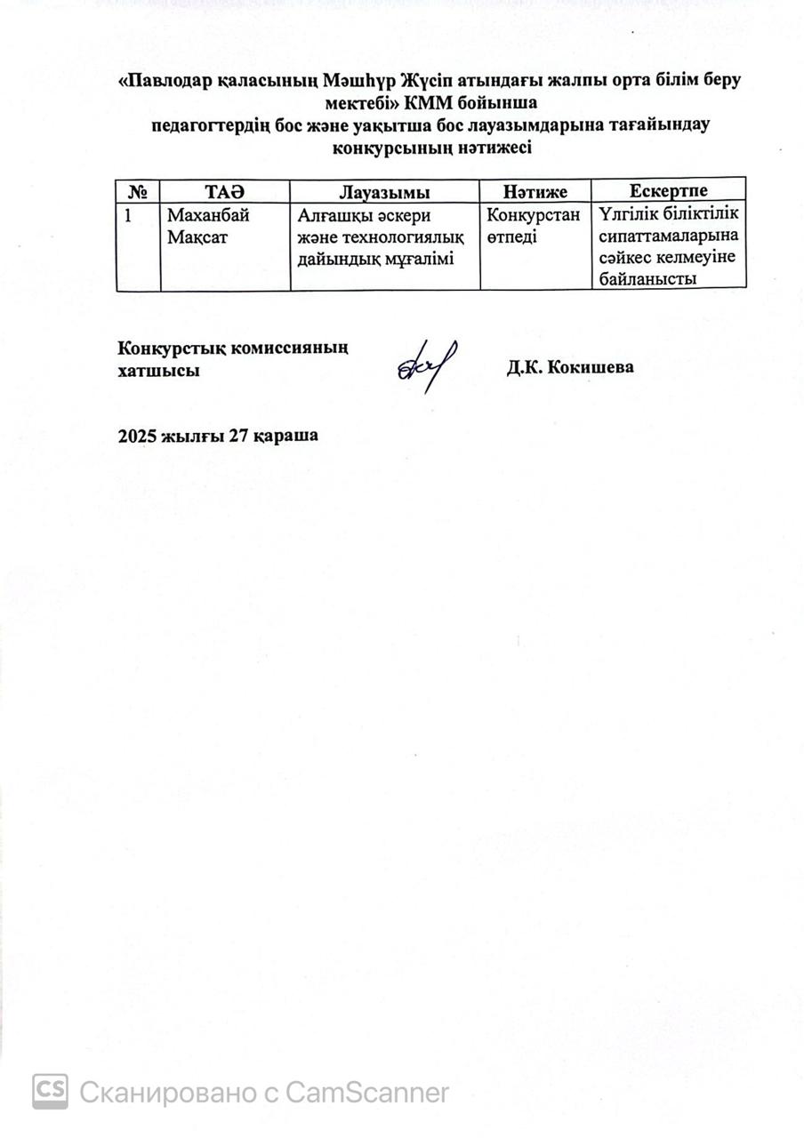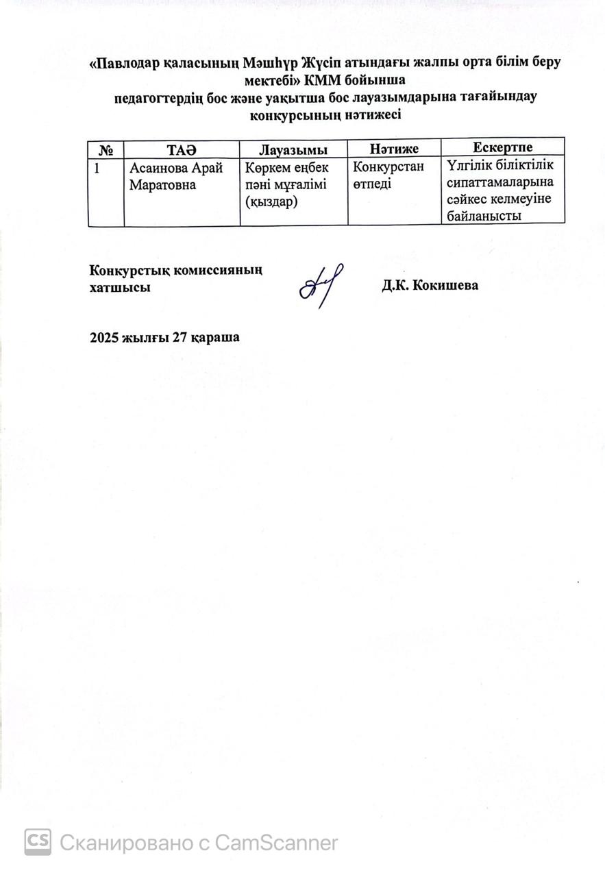 Павлодар облысының білім беру басқармасы, Павлодар қаласы білім беру бөлімінің "Павлодар қаласының №20 лицей-мектебі" КММ бойынша педагогтердің бос және (немесе) уақытша бос лауазымдарына тағайындау конкурсының нәтижесі.