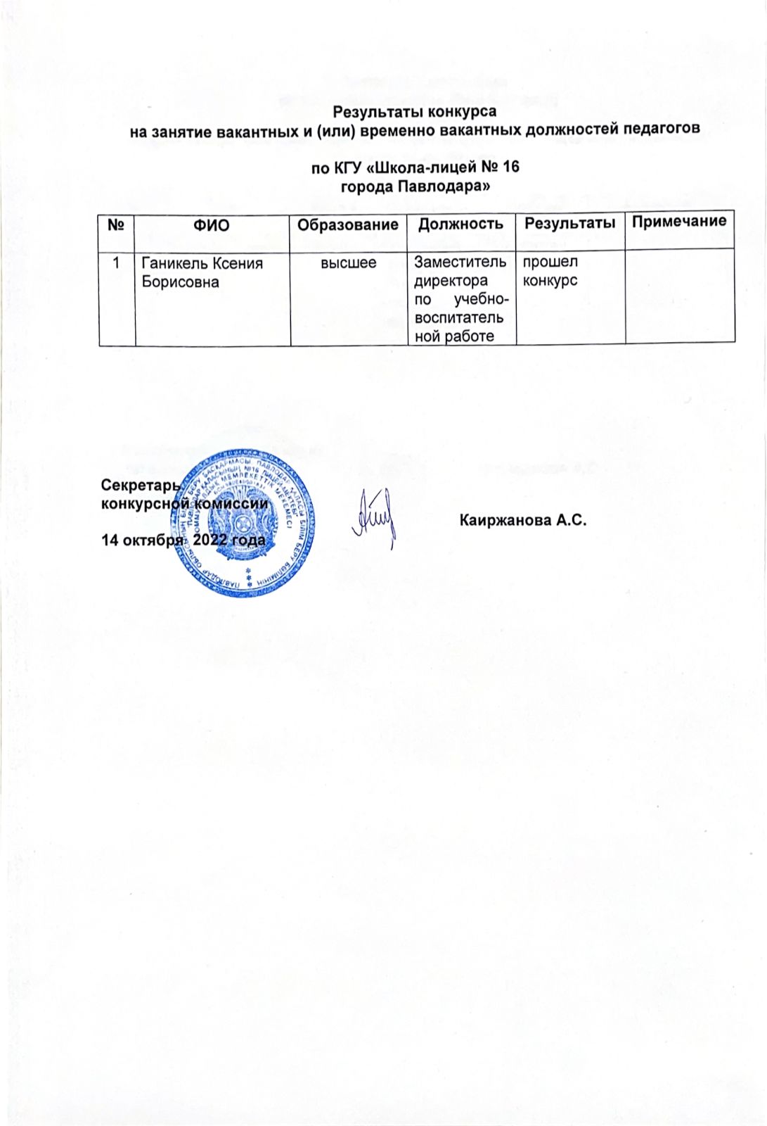 Результаты конкурса на занятие вакантных должностей | көшіріп алу |