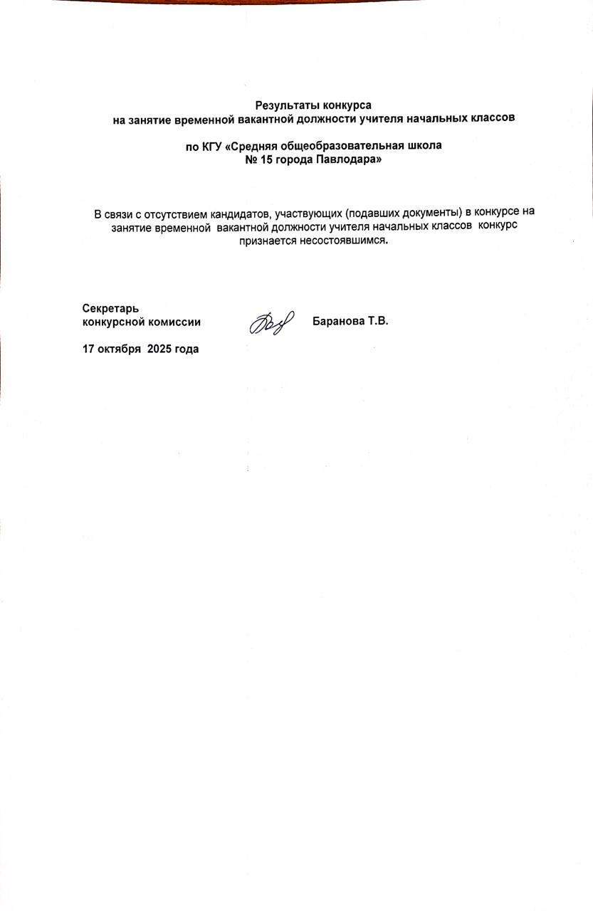 Павлодар облысының білім беру басқармасы, Павлодар қаласы білім беру бөлімінің "Павлодар қаласының №15 жалпы орта білім беру мектебі" КММ, орыс тілінде оқытатын бастауыш сынып мұғалімі лауазымына конкурс жариялайды (тұрақты бос лауазымына) | көшіріп алу қарау |