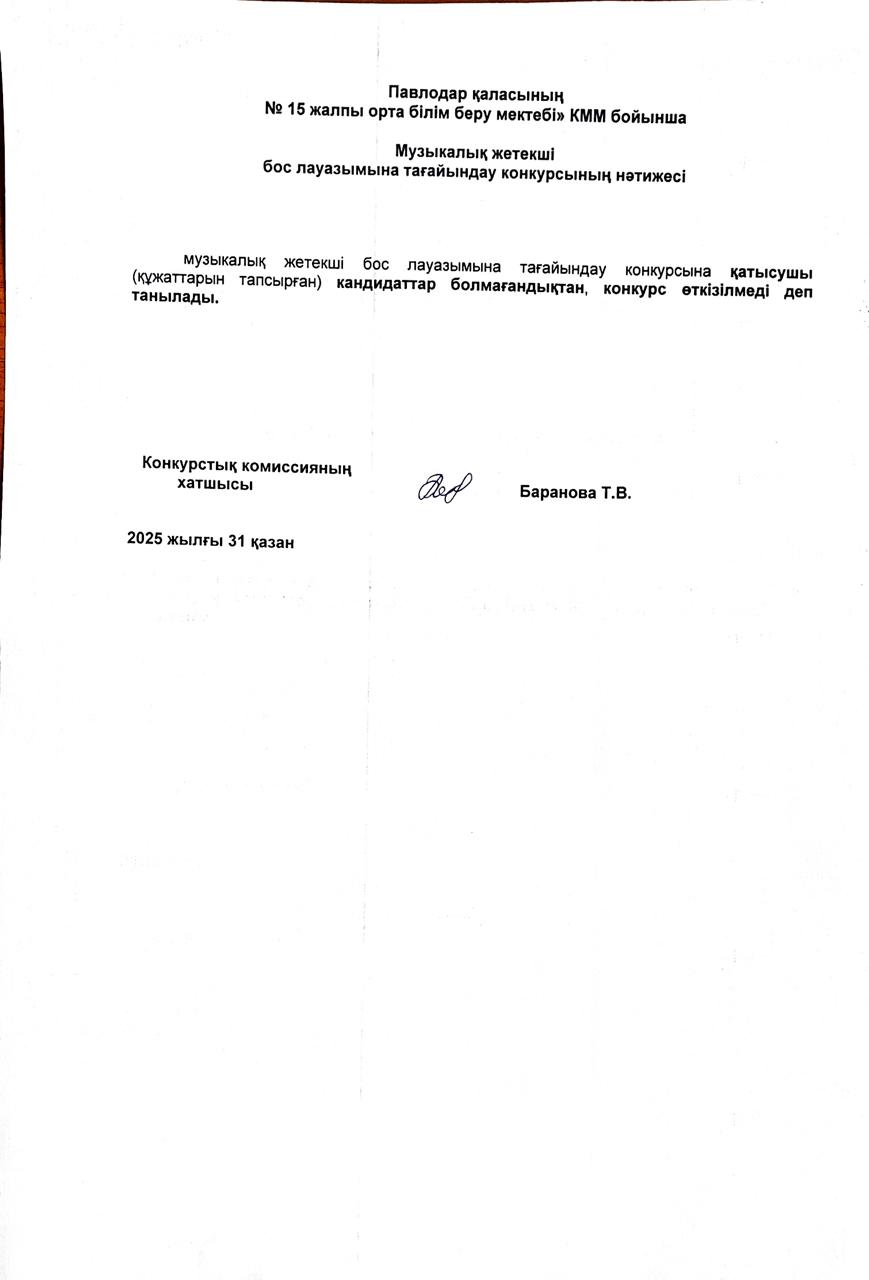 Павлодар облысының білім беру басқармасы, Павлодар қаласы білім беру бөлімінің "Павлодар қаласының №15 жалпы орта білім беру мектебі" КММ, орыс тілінде оқытатын музыка жетекшісі лауазымына конкурс жариялайды (тұрақты бос лауазымына) | көшіріп алу қарау |