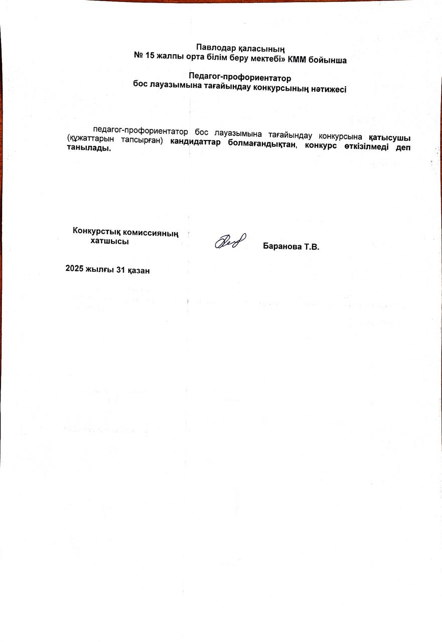 Павлодар облысының білім беру басқармасы, Павлодар қаласы білім беру бөлімінің "Павлодар қаласының №15 жалпы орта білім беру мектебі" КММ, педагог-профориентатор лауазымына конкурс жариялайды (тұрақты бос лауазымына) | көшіріп алу қарау |