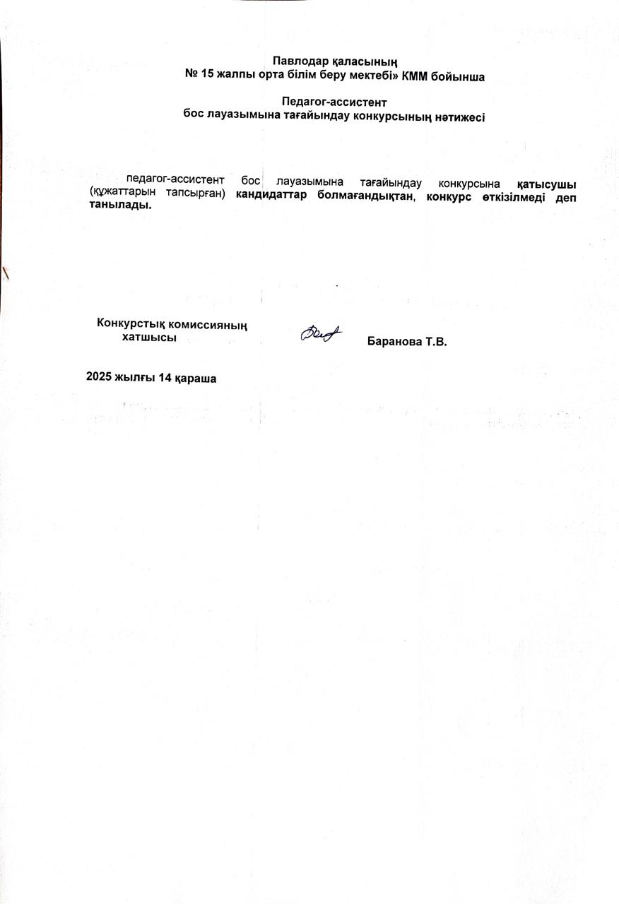 Павлодар облысының білім беру басқармасы, Павлодар қаласы білім беру бөлімінің "Павлодар қаласының №15 жалпы орта білім беру мектебі" КММ, орыс тілінде оқытатын педагог-ассистент лауазымына конкурс жариялайды | көшіріп алу қарау |