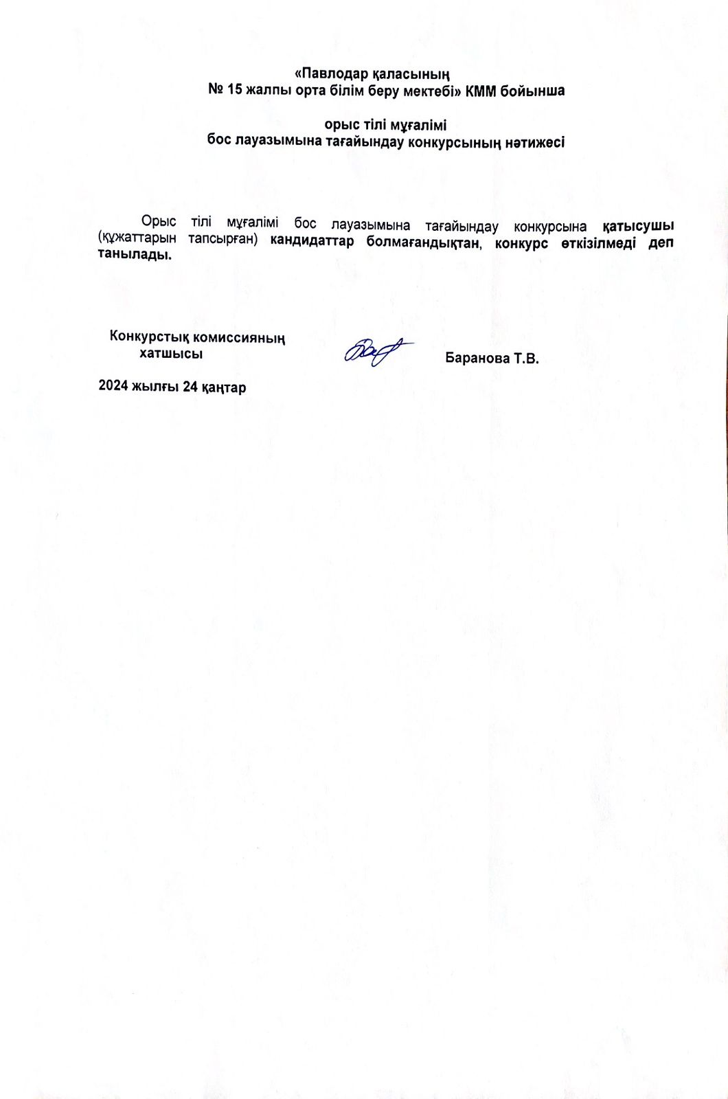 «Павлодар қаласының №15 жалпы орта білім беретін мектебі» КММ орыс тілінде оқытатын сыныптарда бастауыш сынып мұғалімінің бос лауазымына конкурс қорытындысының күшін жою туралы бұйрығы | көшіріп алу |