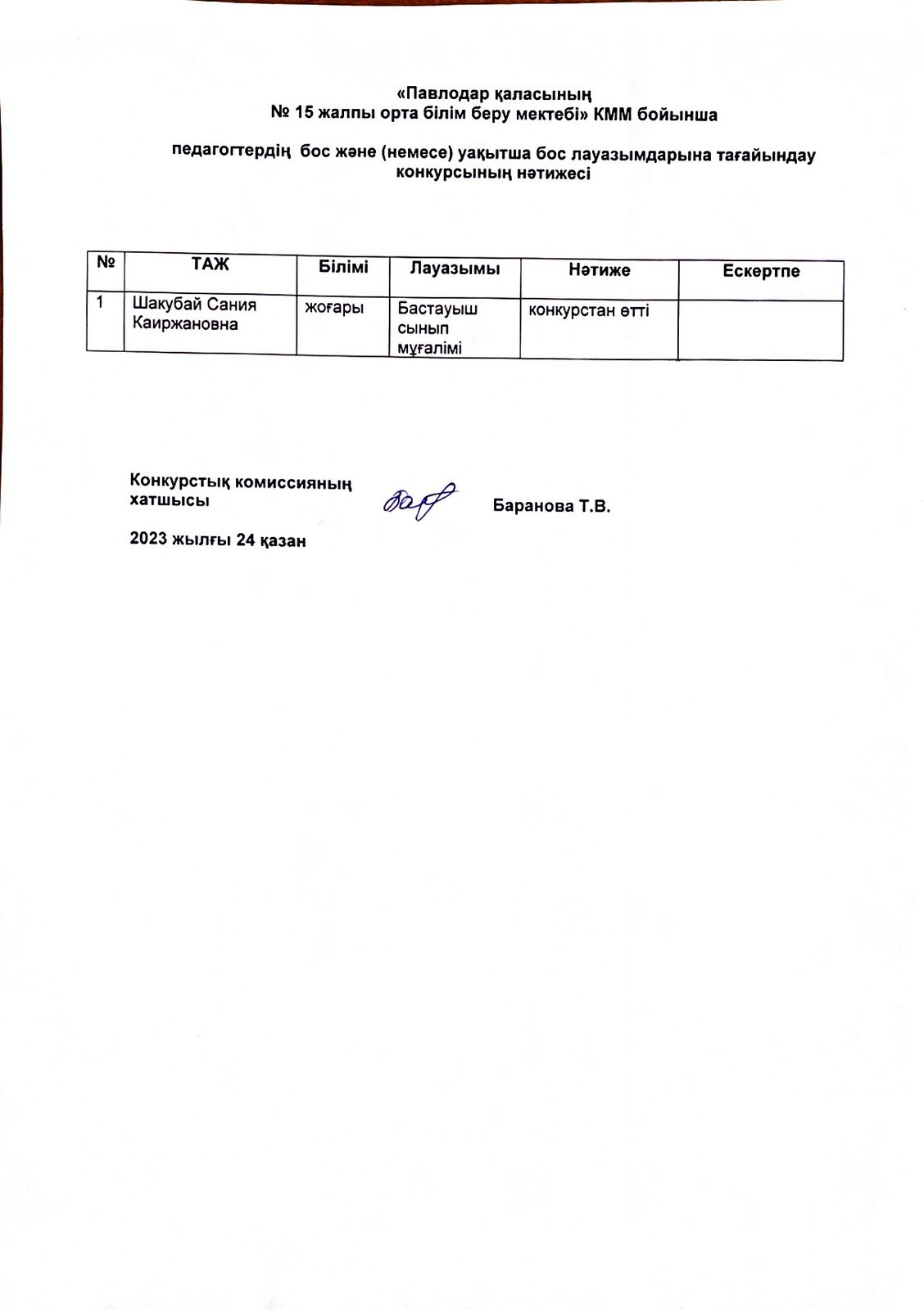"Павлодар қаласының №15 жалпы орта білім беру мектебі" КММ бойынша педагогтердің бос лауазымдарына тағайындау конкурсының нәтижесі