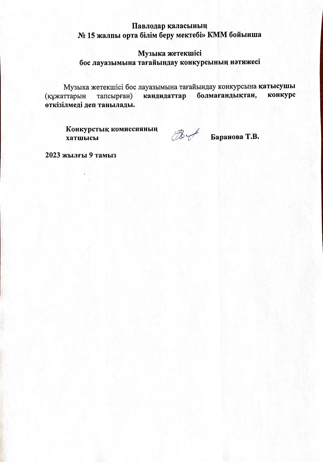 "Павлодар қаласының №15 жалпы орта білім беру мектебі" КММ бойынша педагогтердің бос лауазымдарына тағайындау конкурсының нәтижесі