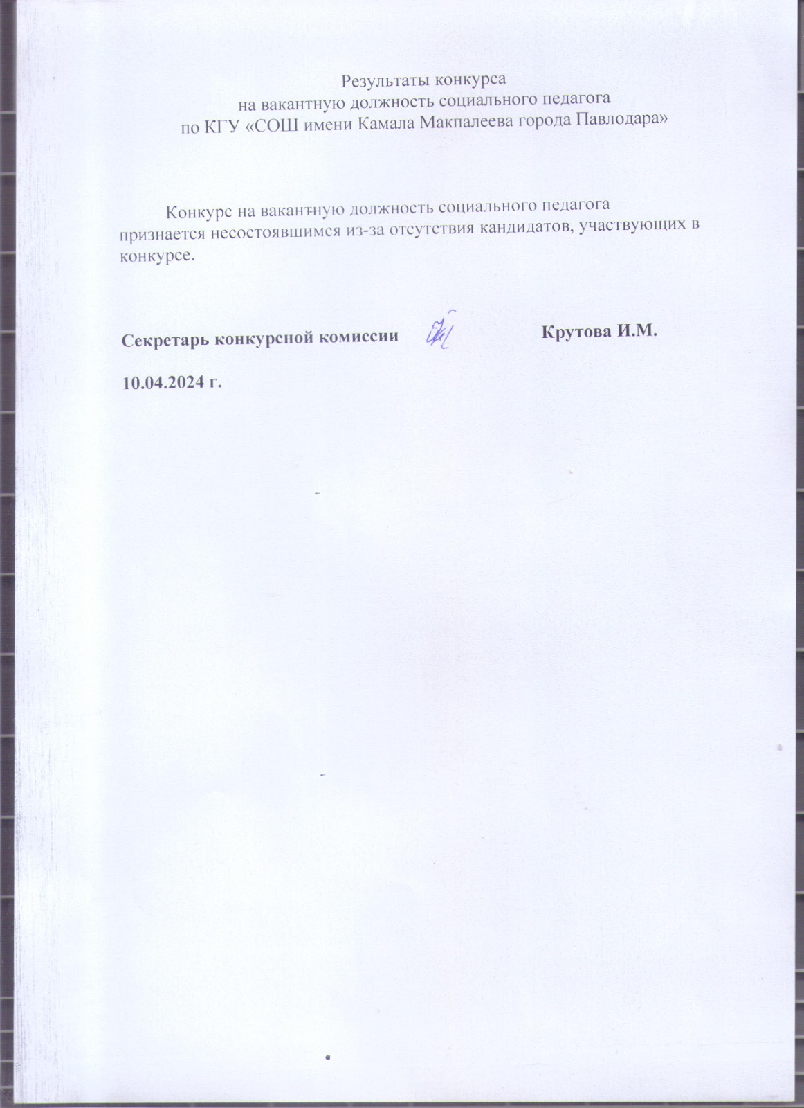 Результаты конкурса на вакантную должность социального педагога по КГУ “СОШ им.К Макпалеева г. Павлодара» | көшіріп алу |