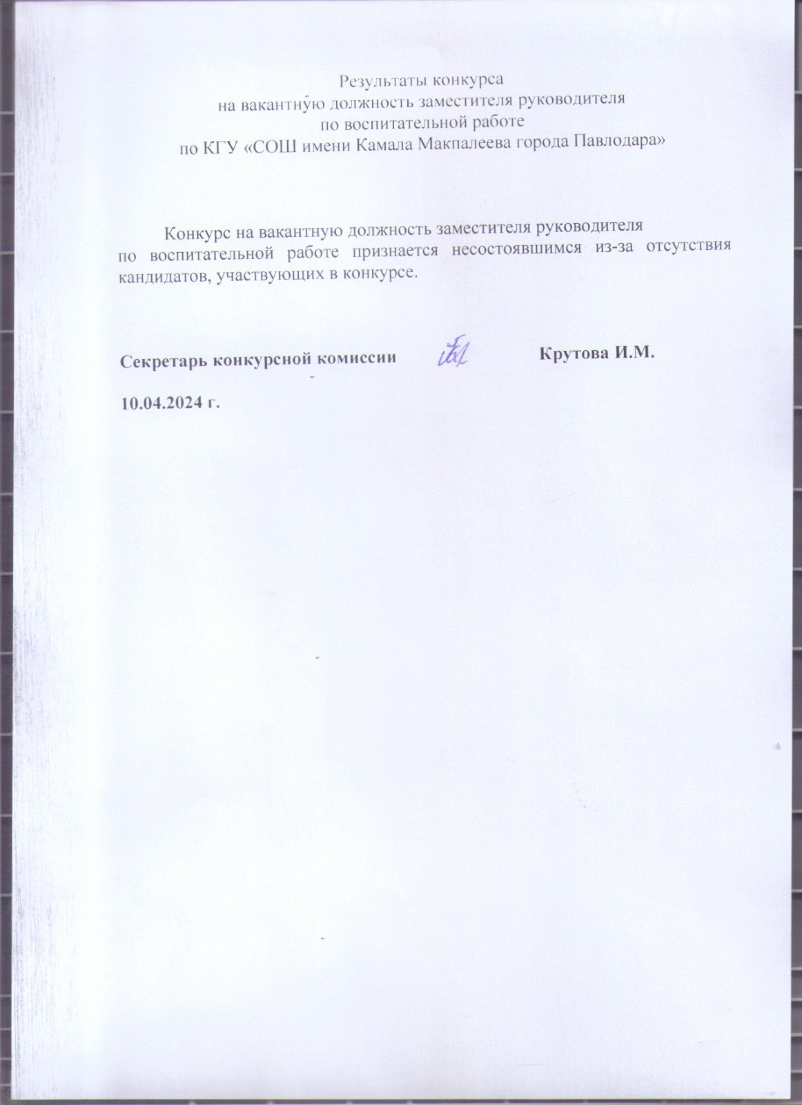Результаты конкурса на вакантную должность заместитель руководителя по воспитательной работе по КГУ “СОШ им.К Макпалеева г. Павлодара» | көшіріп алу |