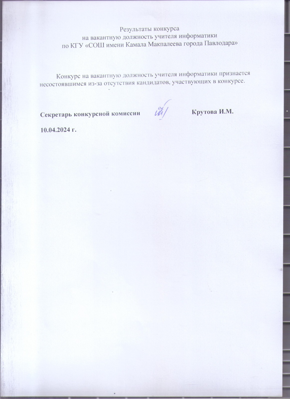 Результаты конкурса на вакантную должность учителя информатики по КГУ “СОШ им.К Макпалеева г. Павлодара» | көшіріп алу |