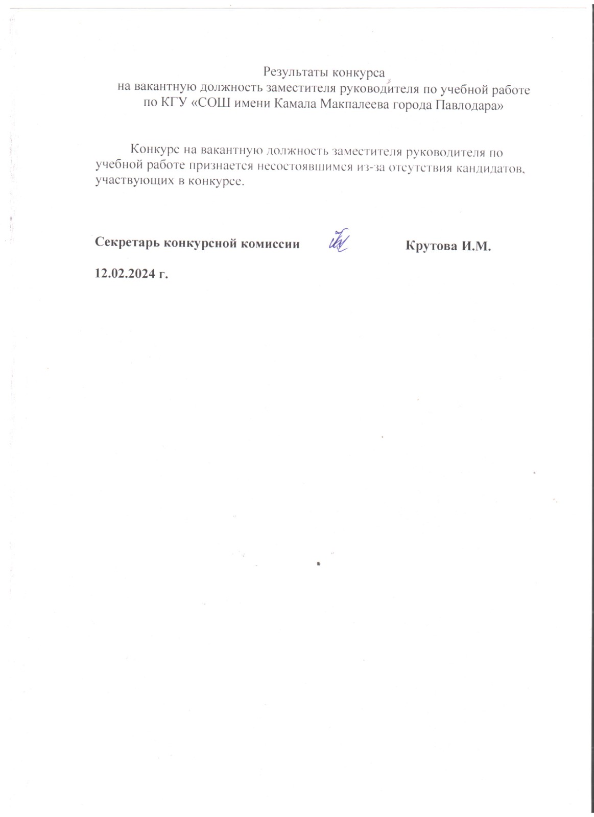 Результаты конкурса на вакантную должность руководителя по учебной работе по КГУ “СОШ им.К Макпалеева г. Павлодара» | көшіріп алу |