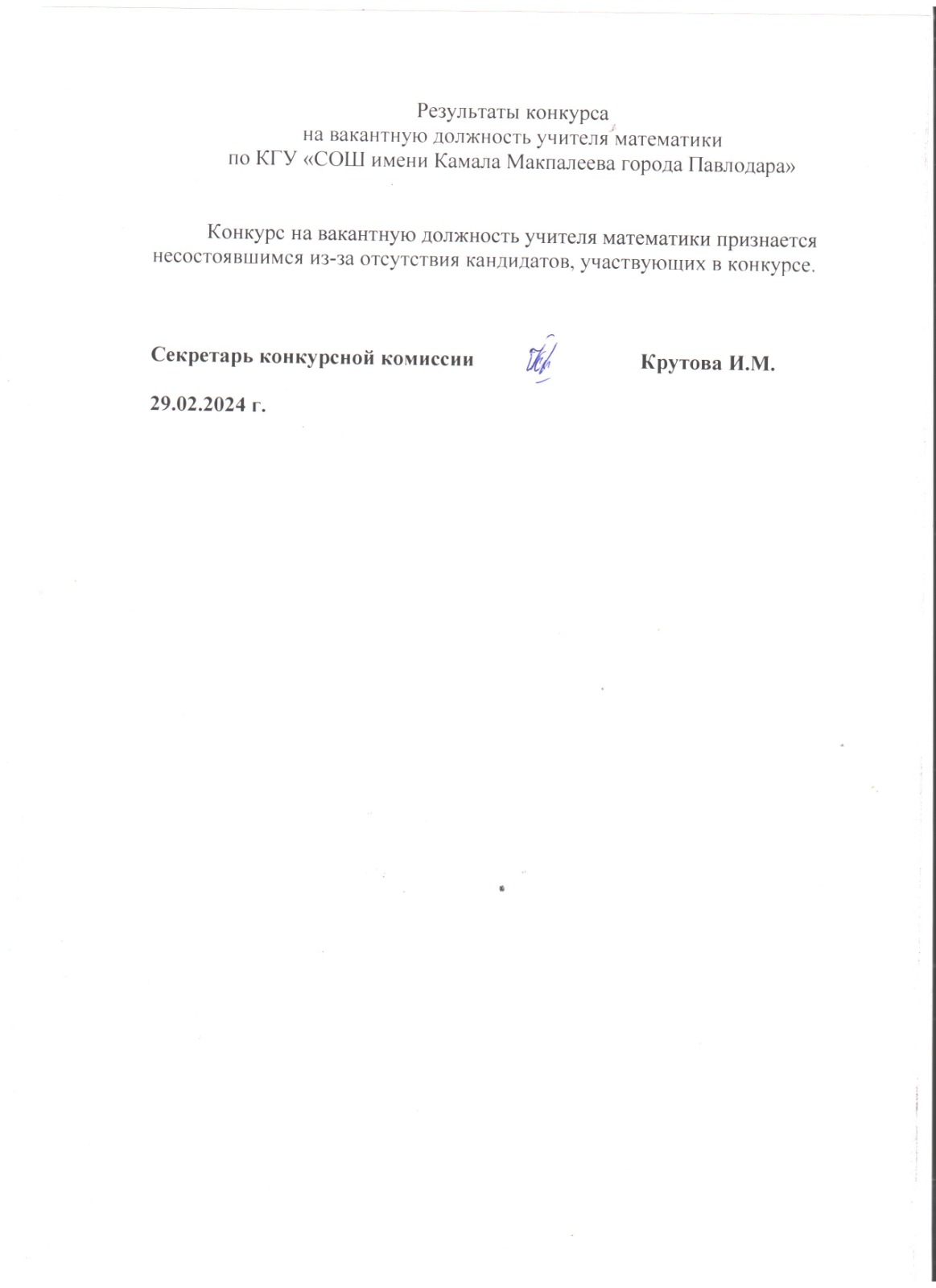 Результаты конкурса на вакантную должность учителя математики по КГУ “СОШ им.К Макпалеева г. Павлодара» | көшіріп алу |