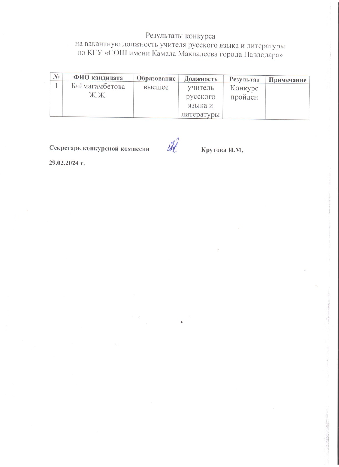Результаты конкурса на вакантную должность учителя русского языка и литературы по КГУ “СОШ им.К Макпалеева г. Павлодара» | көшіріп алу |