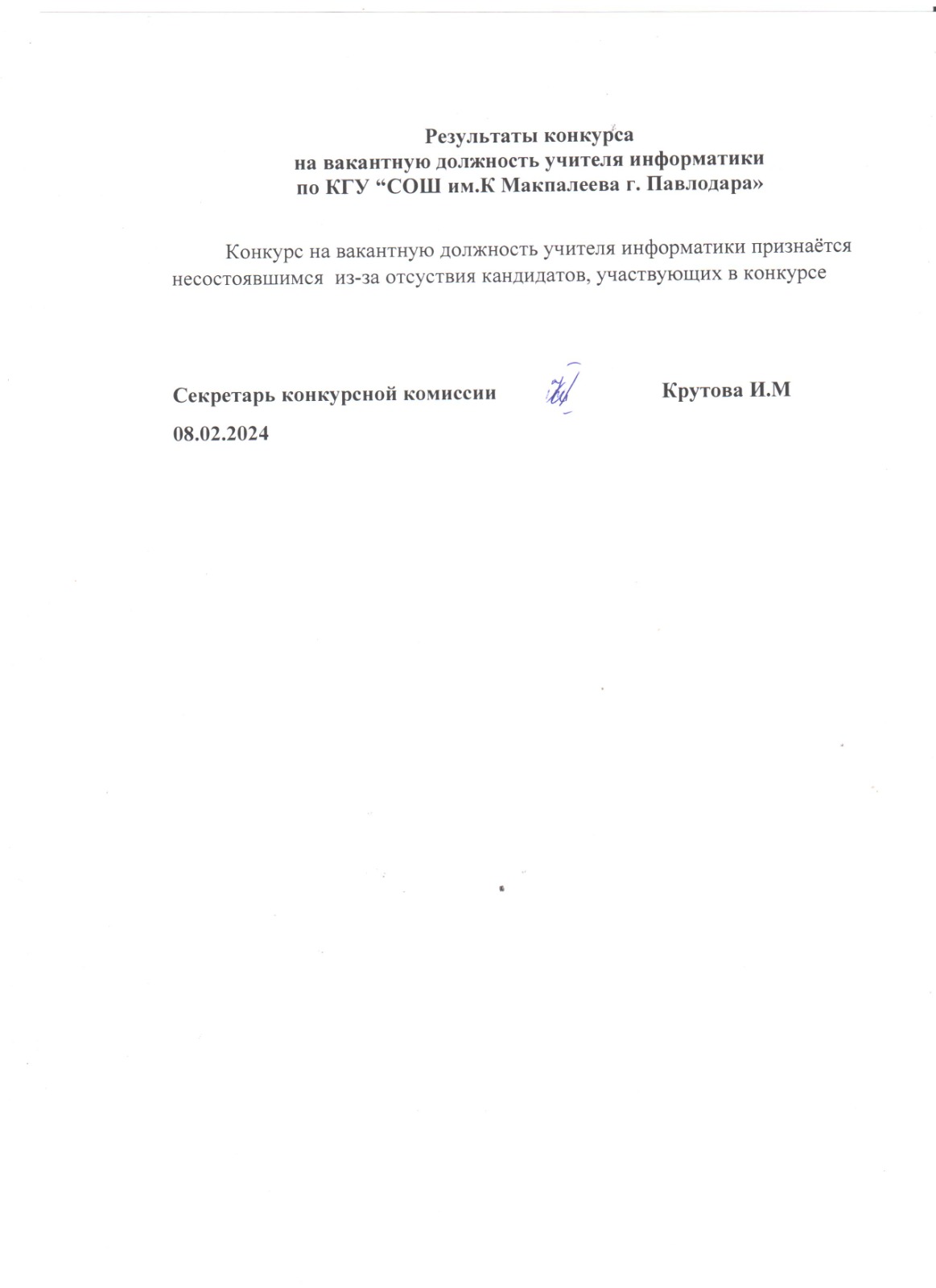 Результаты конкурса на вакантную должность учителя информатики по КГУ “СОШ им.К Макпалеева г. Павлодара»