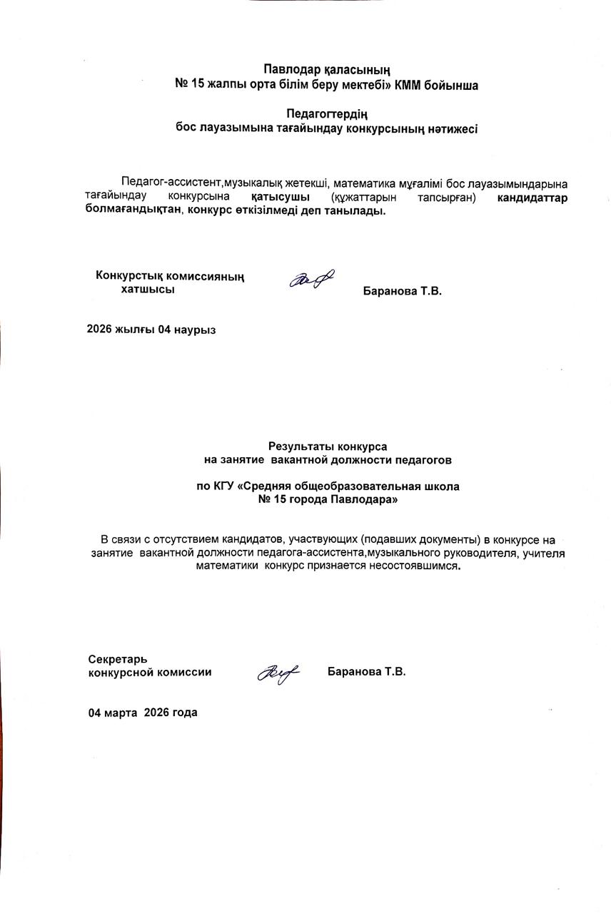 КГУ "Средняя общеобразовательная школа №15 города Павлодара" отдела образования города Павлодара, управления образования Павлодарской области объявляет конкурс на должность музыкального руководителя с русским языком обучения (на постоянную вакантную должность)