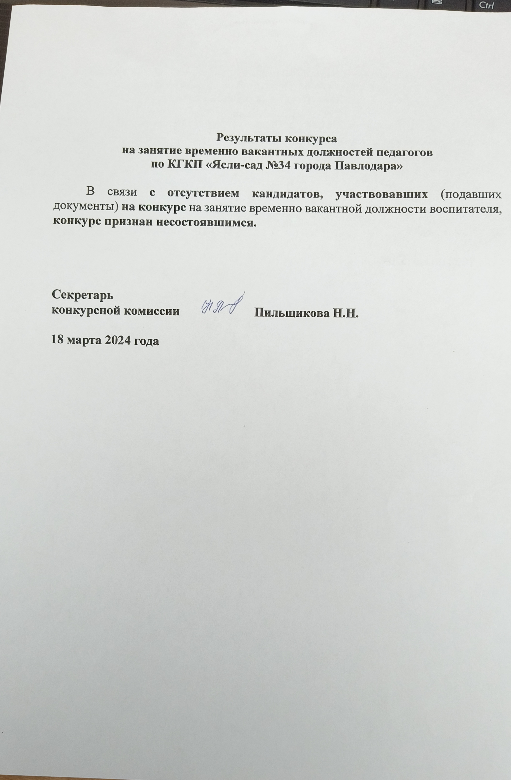 Результаты конкурса на занятие вакантных и (или) временно вакантных должностей педагогов по КГКП «Ясли-сад № 34 города Павлодара» | Скачать Смотреть |