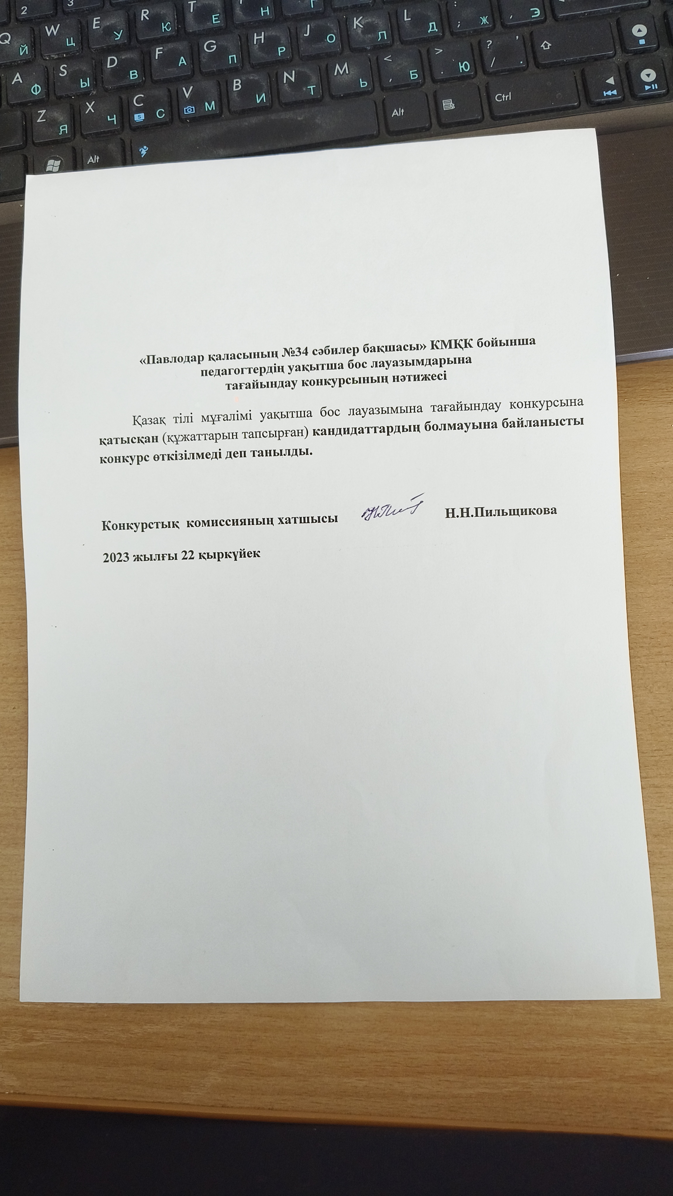 Результаты конкурса на занятие вакантных и (или) временно вакантных должностей педагогов по КГКП «Ясли-сад № 34 города Павлодара»