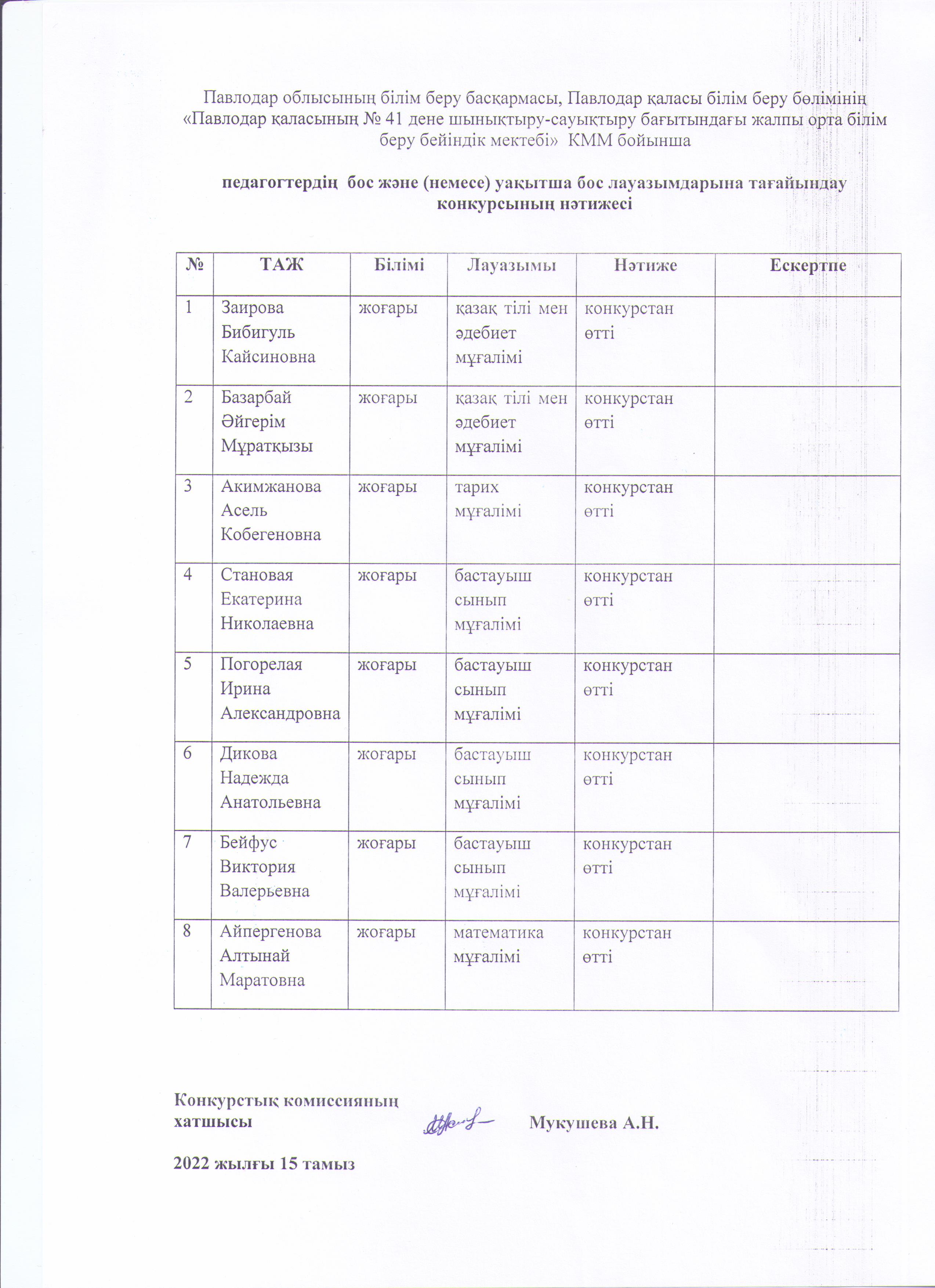 Павлодар облысының білім беру басқармасы, Павлодар қаласы білім беру бөлімінің «Павлодар қаласының № 41 дене шынықтыру-сауықтыру бағытындағы жалпы орта білім беру бейіндік мектебі» КММ бойынша педагогтердің бос және (немесе) уақытша бос лауазымдарына тағайындау конкурсының нәтижесі | Скачать |