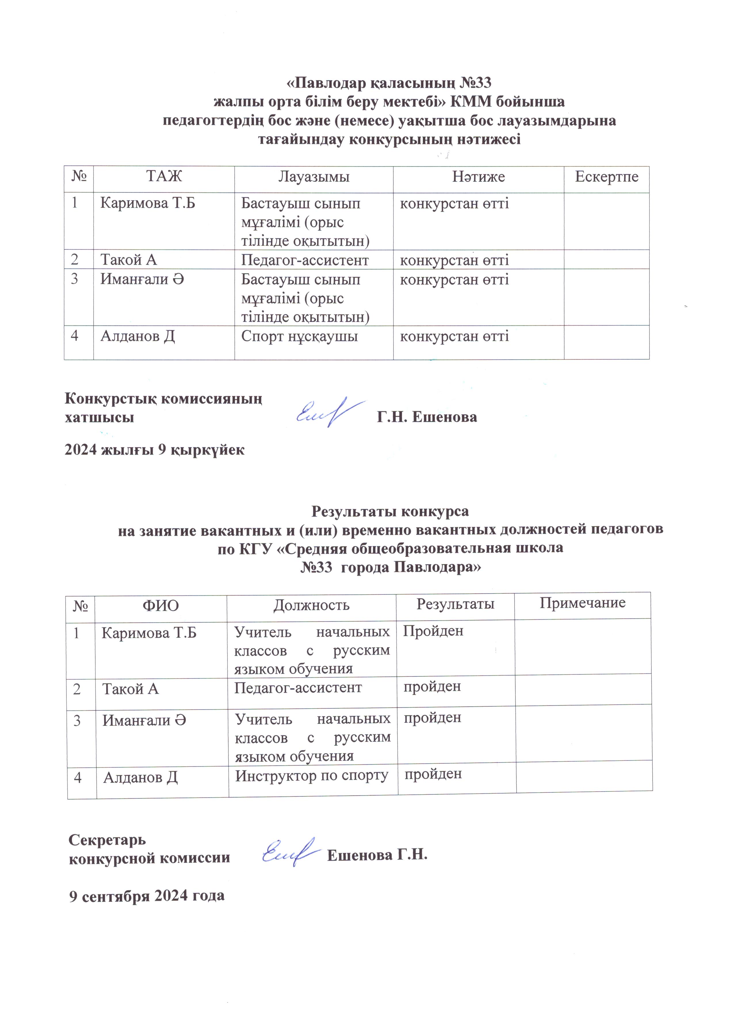 Результаты конкурса на занятие вакантных и (или) временно вакантных должностей педагогов по КГУ «Средняя общеобразовательная школа №33 города Павлодара» | Скачать Смотреть |