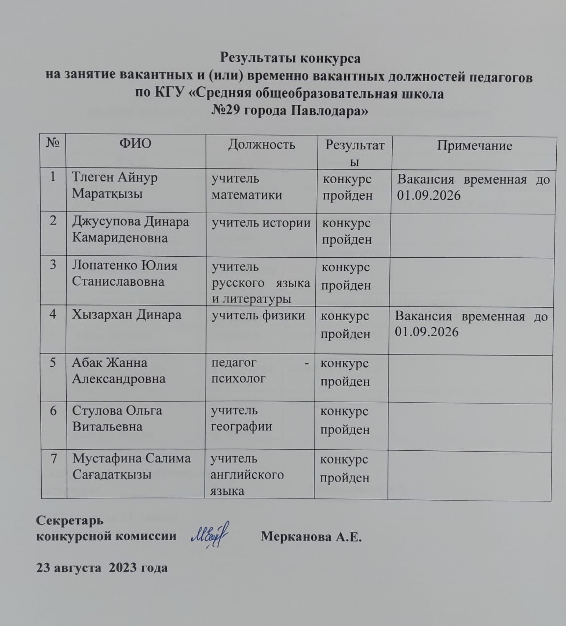 «Павлодар қаласының №29 жалпы орта білім беру мектебі» КММ бойынша педагогтердің бос және (немесе) уақытша бос лауазымдарына тағайындау конкурсының нәтижесі | Скачать |