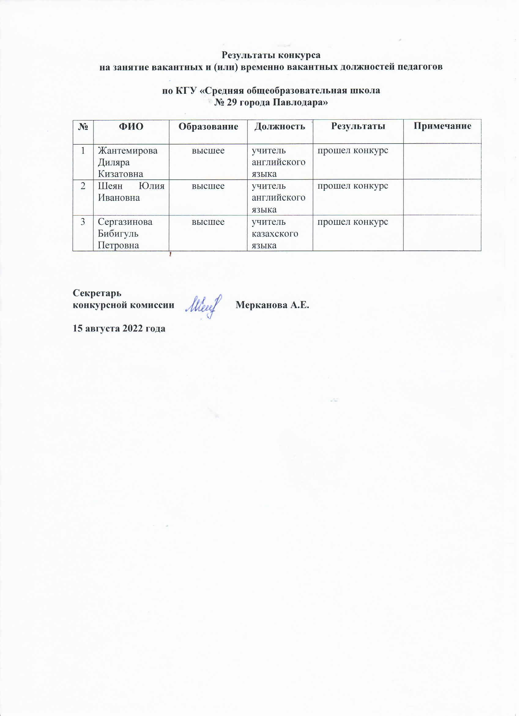 Результаты конкурса на вакантную должность учителей английского и казахского языков в КГУ "СОШ № 29 г. Павлодар | Скачать |