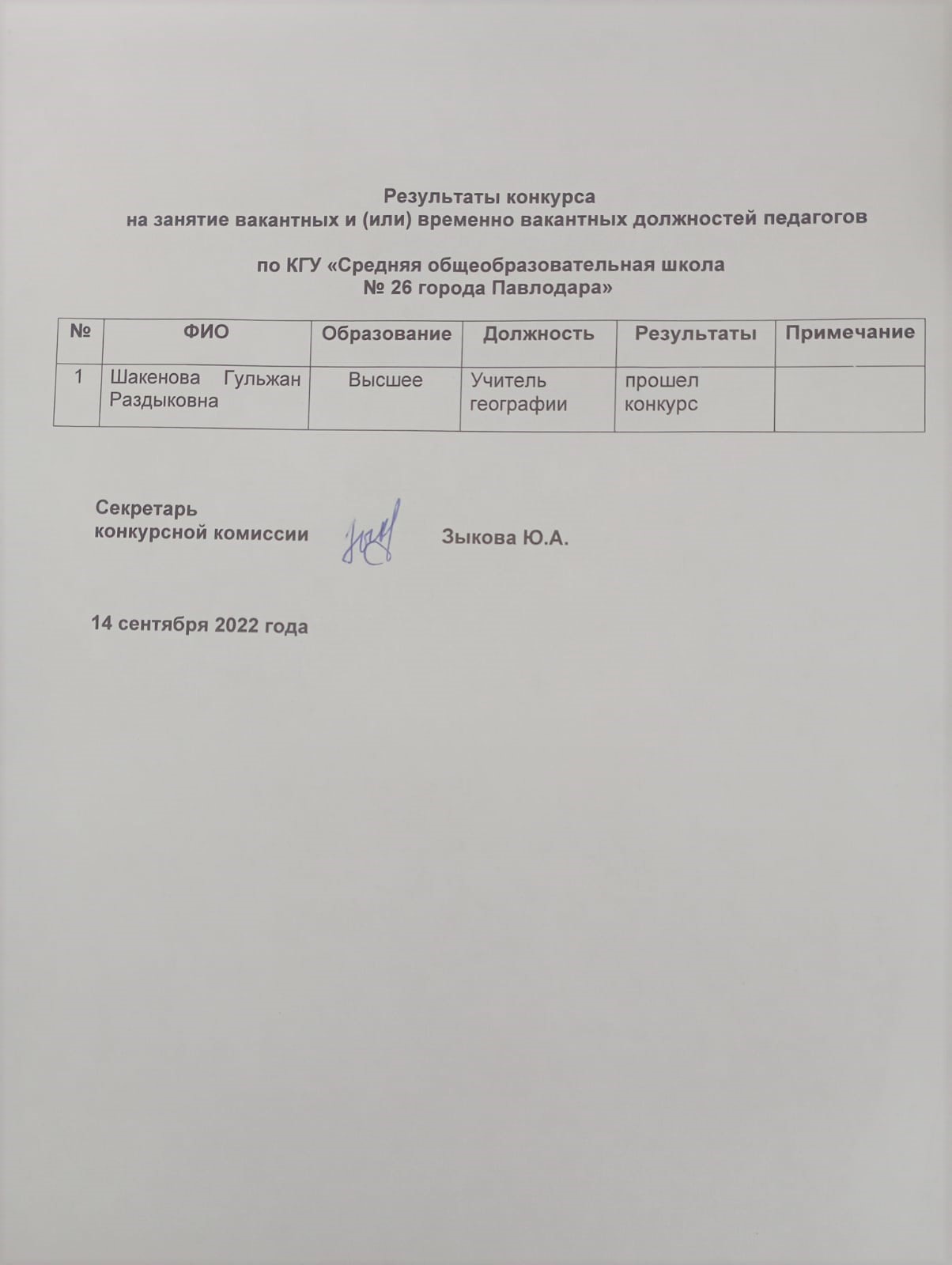 Результаты конкурса №7 на занятие вакантных должностей педагогов по КГУ «Средняя общеобразовательная школа №26 города Павлодара»