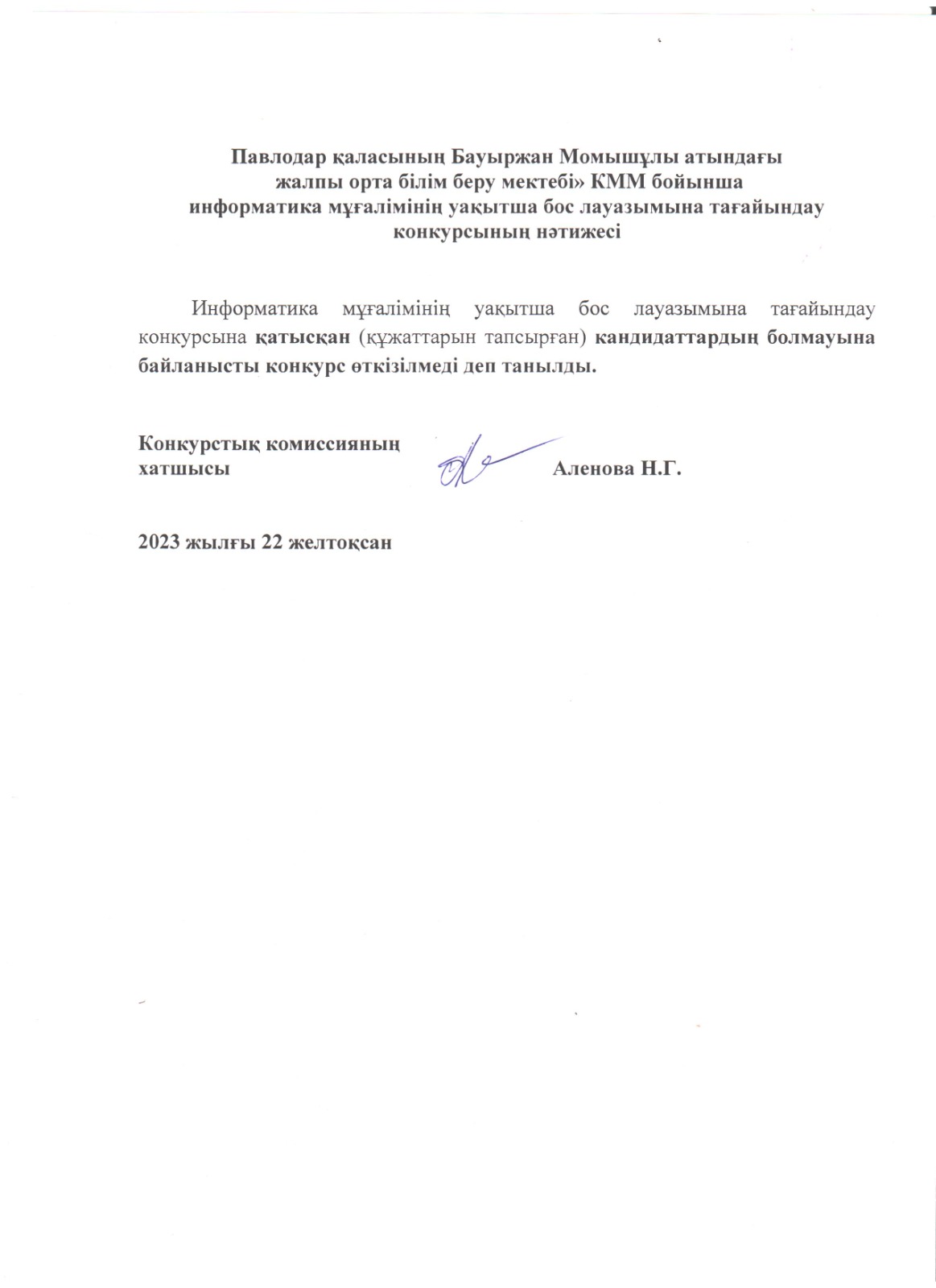 «Павлодар қаласының Бауыржан Момышұлы атындағы жалпы орта білім беру мектебі» КММ бойынша информатика мұғалімі уақытша бос лауазымына тағайындау конкурсының нәтижесі. | Скачать |