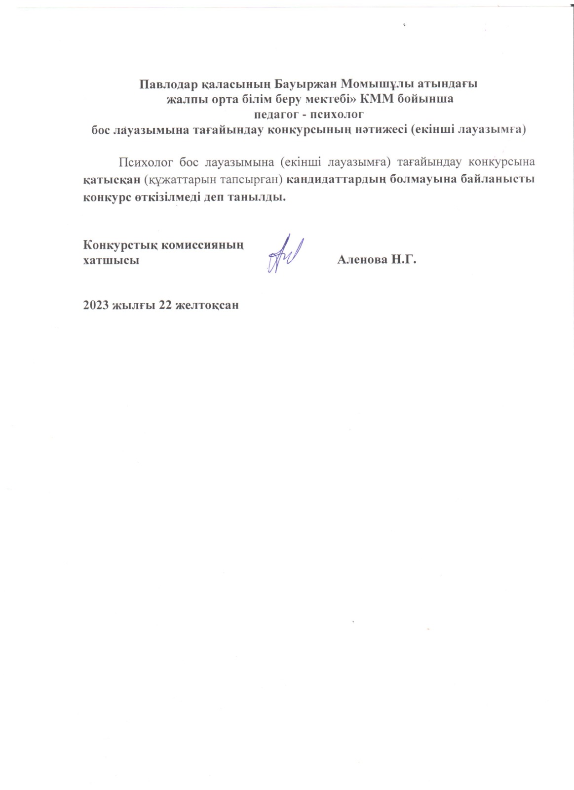 «Павлодар қаласының Бауыржан Момышұлы атындағы жалпы орта білім беру мектебі» КММ бойынша педагог - психолог бос лауазымына (екінші лауазымға) тағайындау конкурсының нәтижесі. | Скачать |