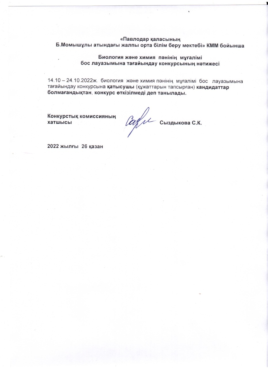"Павлодар қаласының Б.Момышұлы атындағы жалпы орта білім беру мектебі" КММ бойынша мемлекеттік тілде оқытылатын биология және химия мұғалімі бос лауазымына тағайындау конкурсының нәтижесі