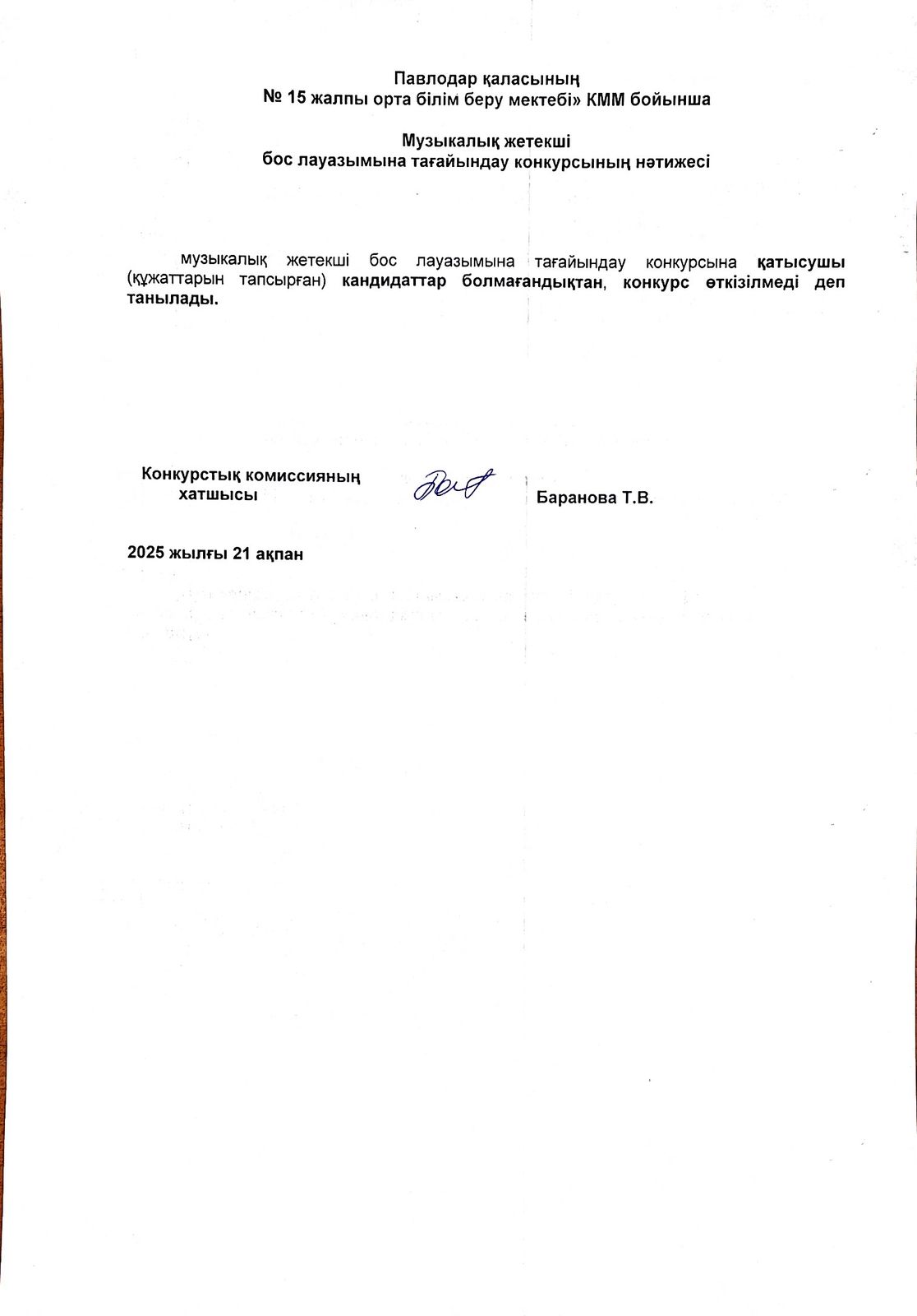 КГУ "Средняя общеобразовательная школа №15 города Павлодара" отдела образования города Павлодара, управления образования Павлодарской области объявляет конкурс на должность музыкального руководителя (на постоянную вакантную должность). | Скачать Смотреть |