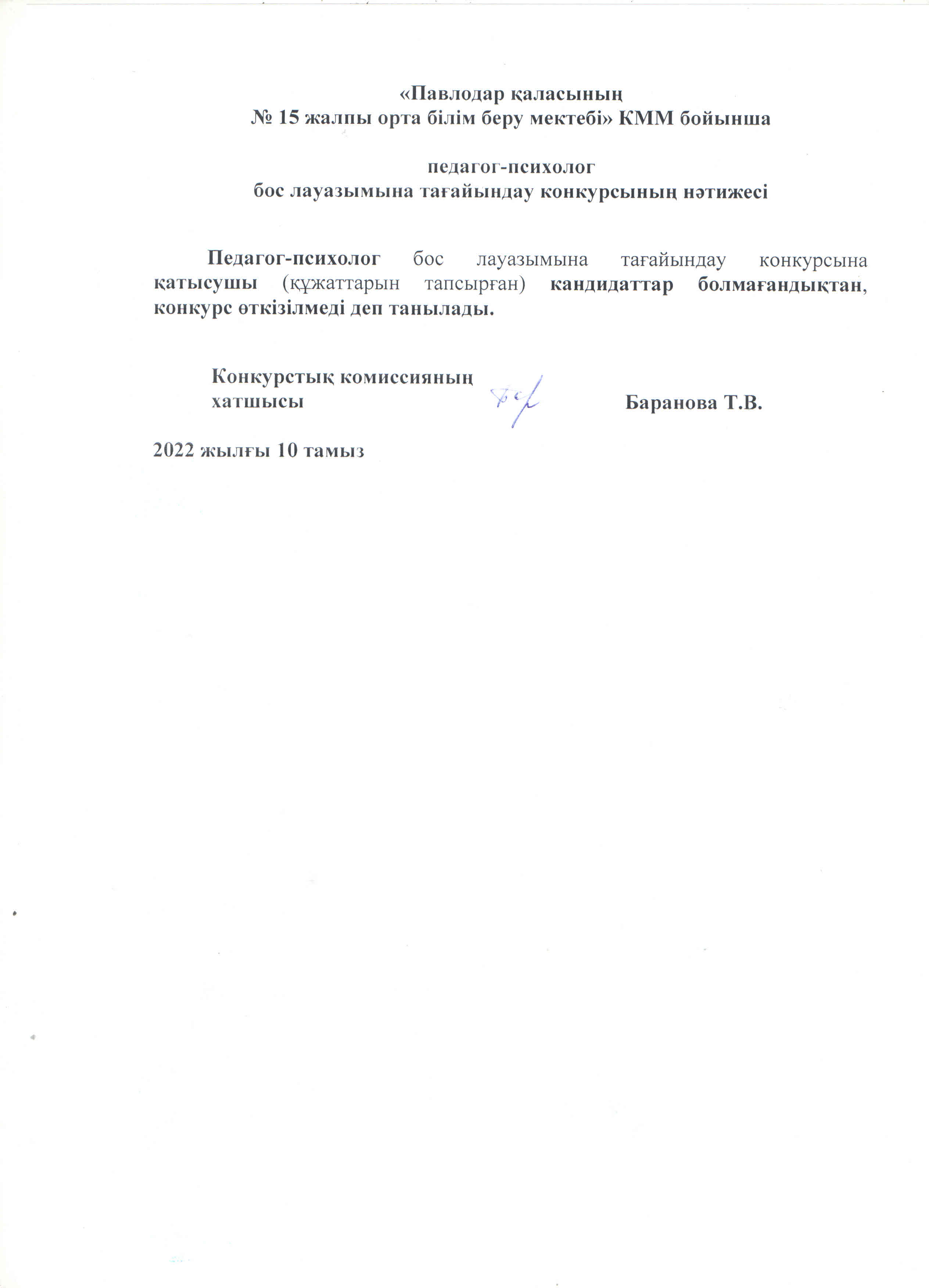 «Павлодар қаласының № 15 жалпы орта білім беру мектебі» КММ бойынша педагог-психолог бос лауазымына тағайындау конкурсының нәтижесі | Скачать |