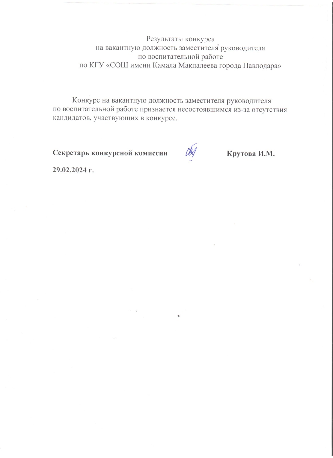Результаты конкурса на вакантную должность заместитель руководителя по воспитательной работе по КГУ “СОШ им.К Макпалеева г. Павлодара» | көшіріп алу |