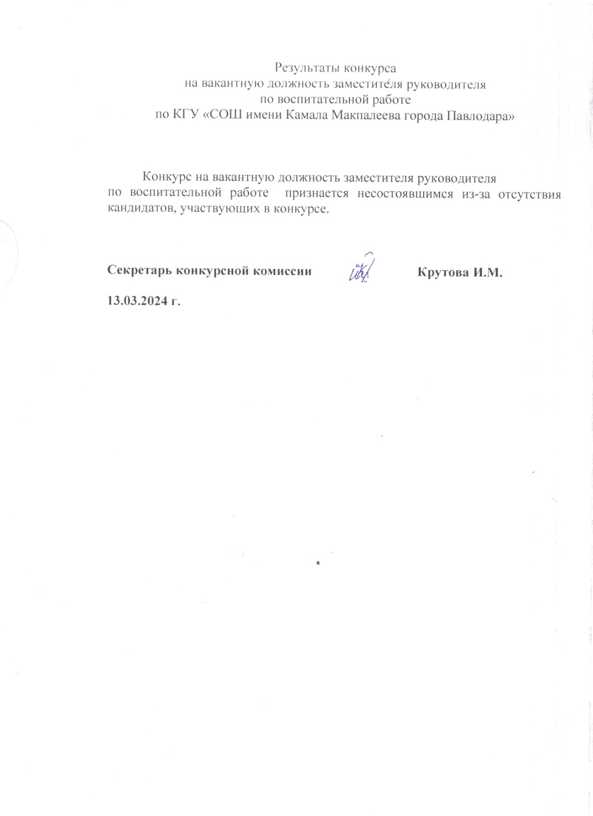 Результаты конкурса на вакантную должность заместитель руководителя по воспитательной работе по КГУ “СОШ им.К Макпалеева г. Павлодара» | Скачать |