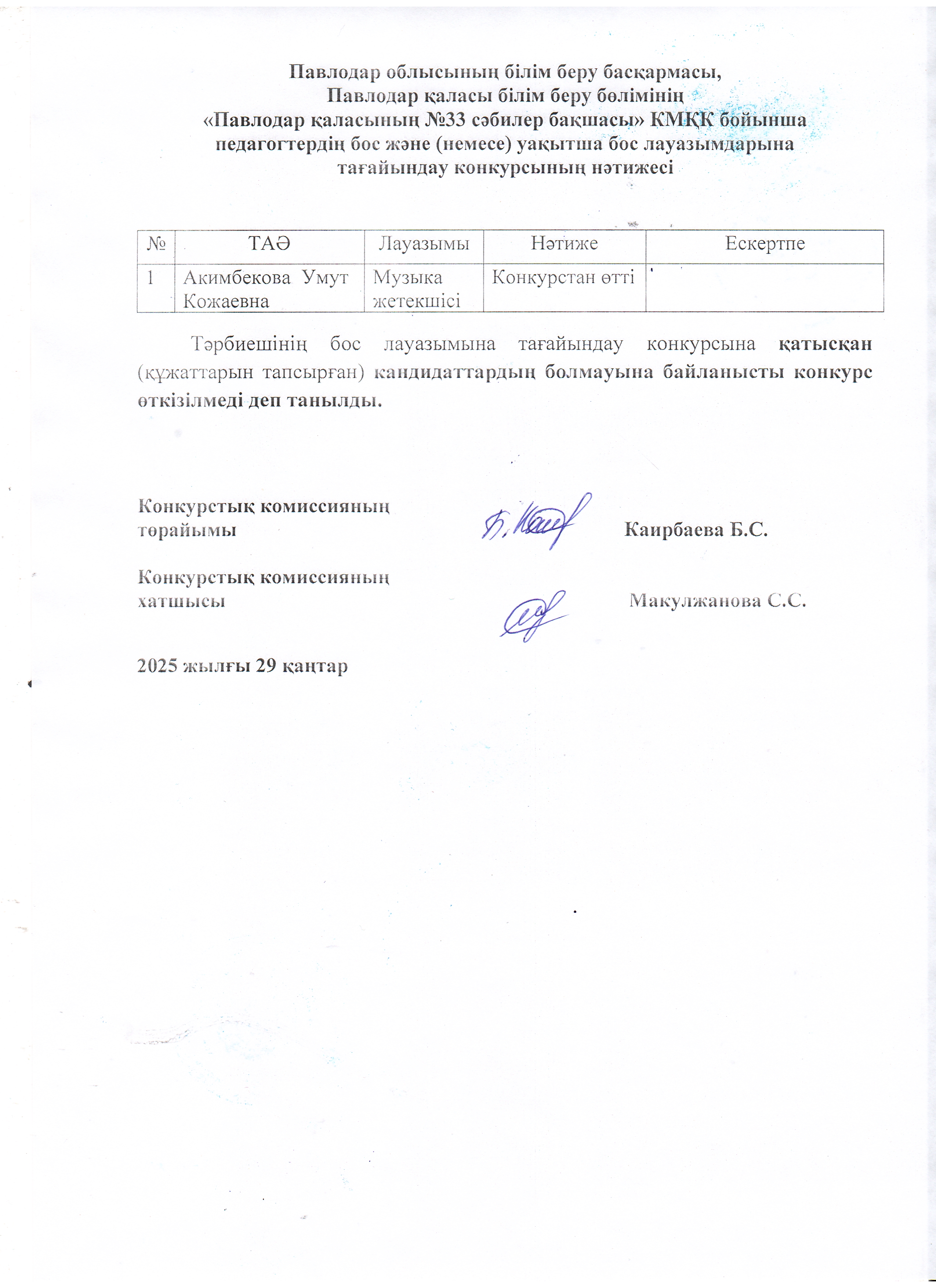 Павлодар облысының білім беру басқармасы, Павлодар қаласы білім беру бөлімінің «Павлодар қаласының №33 сәбилер бақшасы» коммуналдық мемлекеттік қазыналық кәсіпорны тәрбиеші уақытша бос лауазымына орналасуға ашық конкурс нәтижесі | Скачать |