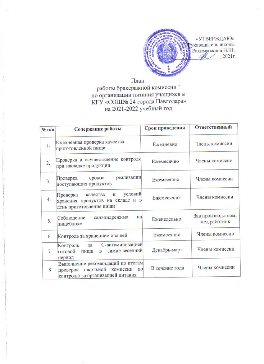 №24 ЖОМ КММ бракераж комиссиясының жұмыс жоспары | көшіріп алу |