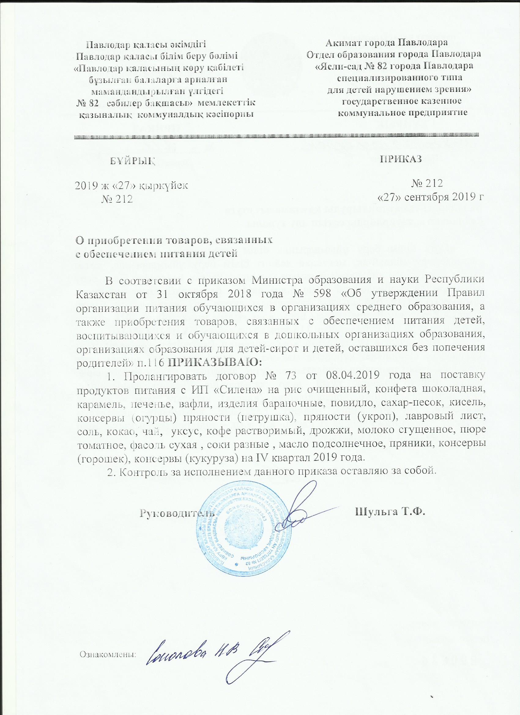 Приказ о продлении договора ИП Силена на 4 кв 2019г | көшіріп алу |